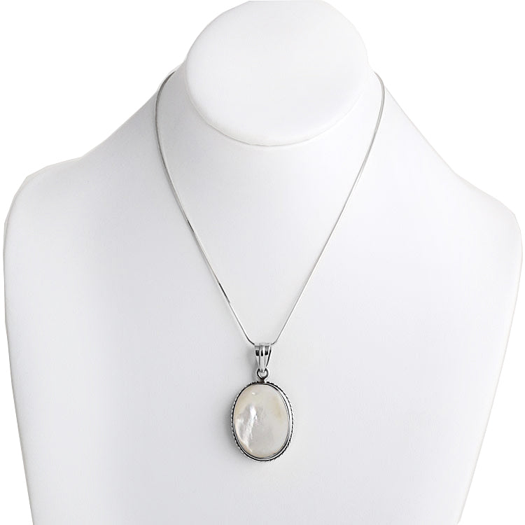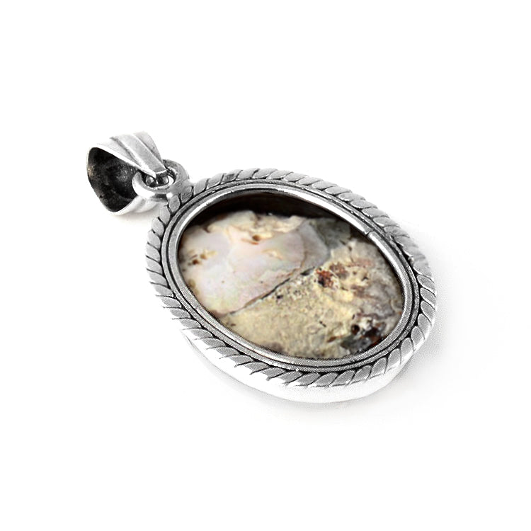 This beautiful pendant features one amazing mother of pearl stone. It sits in sterling .925 silver with an open-faced back, revealing the naturalness of the stone. The silver has been stylized to add to the appeal of this 1 3/4" x 1" pendant.