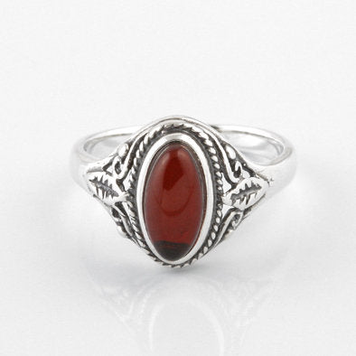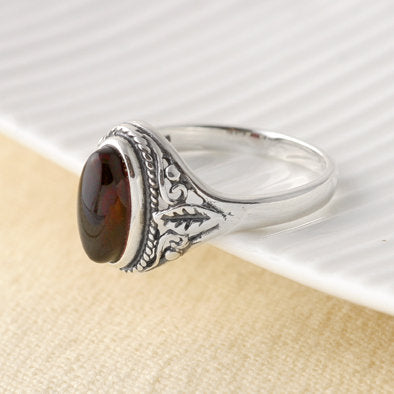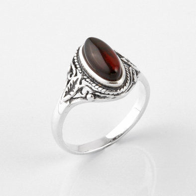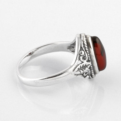 This ornate ring features a rich cherry amber oval set in oxidized .925 sterling silver, blackened to add definition and give the ring an antiqued look. Surrounded by curls and accented on either side by a small silver leaf, this ring captures the classic beauty of amber.