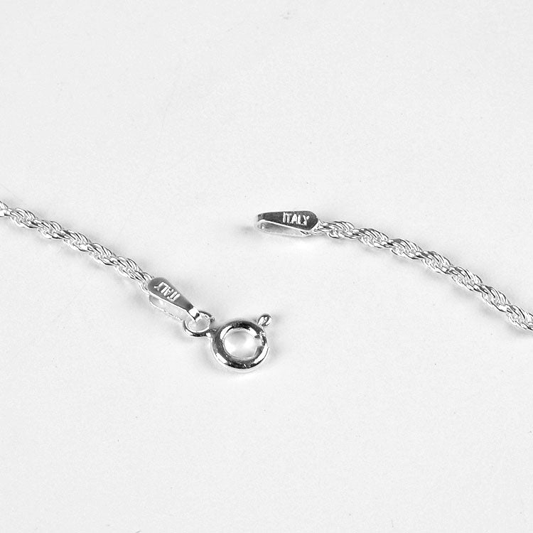 This popular silver chain has quite a bit of sparkle to it! The rope style chain looks great with or without pendants on it. This particular chain is available in numerous lengths and has a classic lobster claw clasp.
