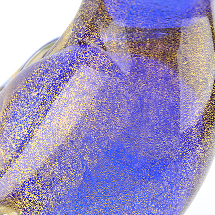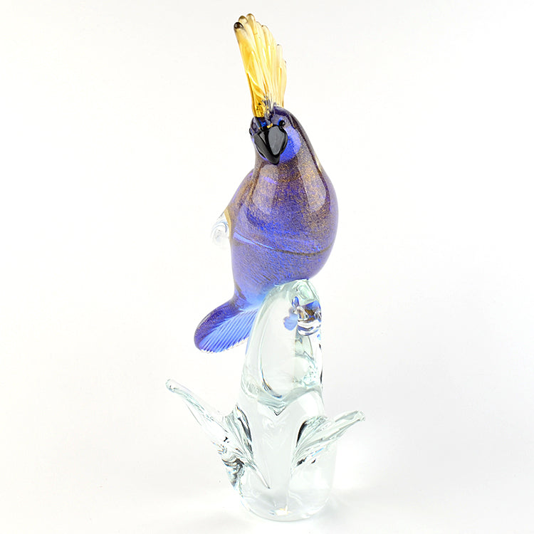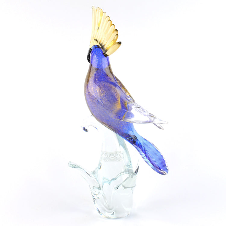 Measuring over a foot tall, this blue cockatoo bird is sure to grab the attention of admirers. Made in Italy by hand, this large art glass piece (Murano Rainbow Glass) features a fancy shimmering 24 kt. gold leaf (and blue) body, a black beak and eyes, a pale yellow crest, and a clear glass perch on which this beautiful bird rests. This cockatoo, and others, raise their crest when they are happy, alarmed, want to play, or just to show off. Measures about 14" tall.
