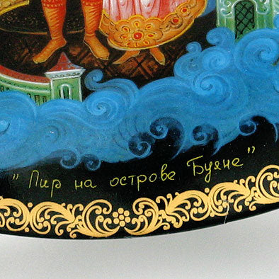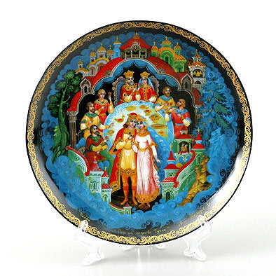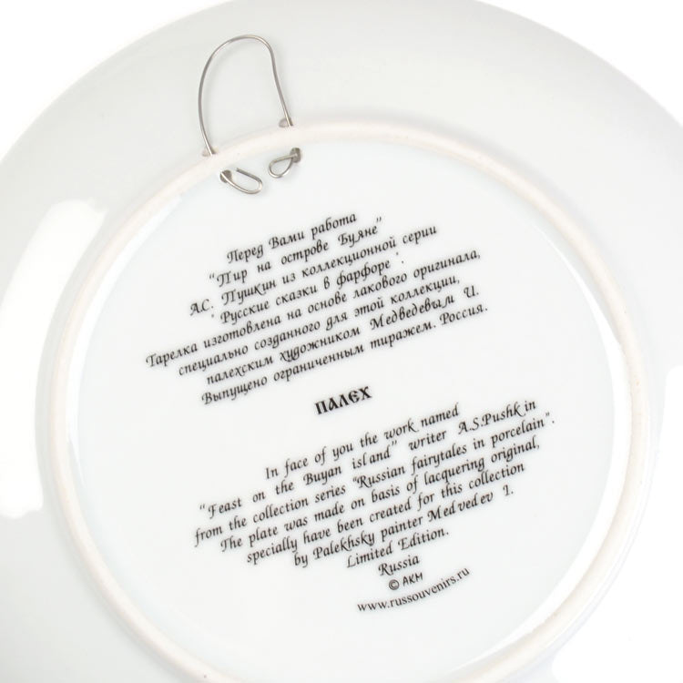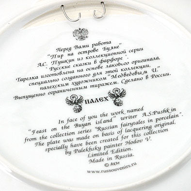In face of you the work named "Feast on the Buyan Island", writer A. S. Pushkin, from the collection series "Russian Fairytales in porcelain". The plate was made on basis of lacquering original, specially have been created for this collection by Palekhsky painter Medvedev I. Limited addition. There is quite a bit of detail in this decorative plate, which includes a golden filigree border. This plate ships in its original Russian box and it includes a clear, plastic stand and a metal hook for hanging. The plate is made of high quality porcelain and the picture is made in the technique of a decal so the price for this decorative plate is quite affordable.
