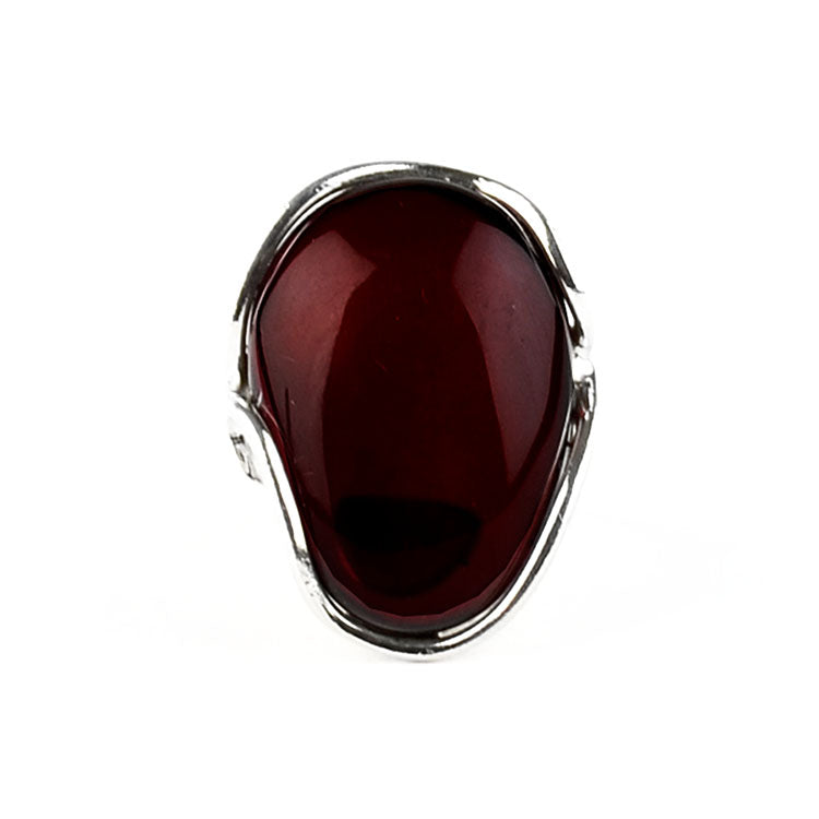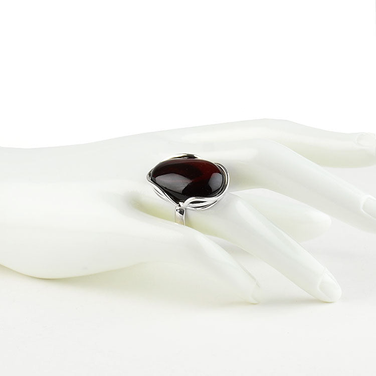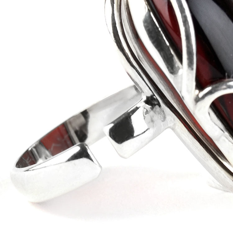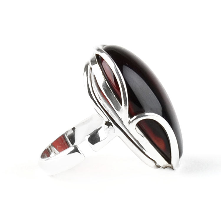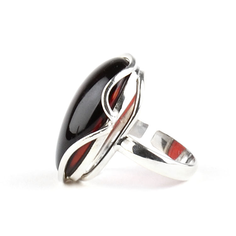This unique, one-of-a-kind Adjustable Size Cherry Amber Ring features genuine cherry color Baltic amber of an oval shape set in an unusual .925 sterling silver setting, forming a contemporary amber and silver design. This delightful ring looks great on any finger. Size is adjustable from size 7 to size 8.Each piece of our jewelry is hand crafted and each amber stone has its own uniqueness, therefore they might slightly differ from the photograph. Colors of the amber stone/s might slightly vary from its photos. The digital images we display have the most accurate color possible. However, due to differences in computer monitors, there may be variations in color between the actual product and your screen.