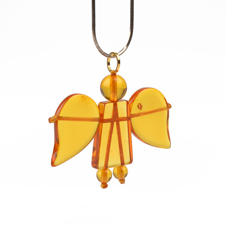 This hand-made pendant is about 1 1/2" x 1 1/2" in size and consists of 6 authentic honey amber pieces, strung together to make up a pretty little angel. The honey amber is very translucent and lightweight. The simple round bail is gold tone. Chain not included.