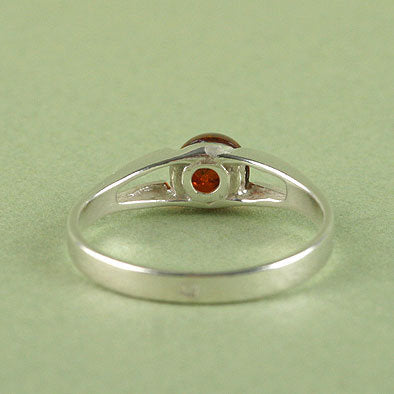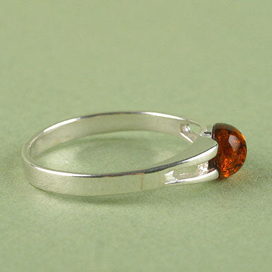 This contemporary honey amber ring is set in a sterling silver band. The stone measures about 3/16".