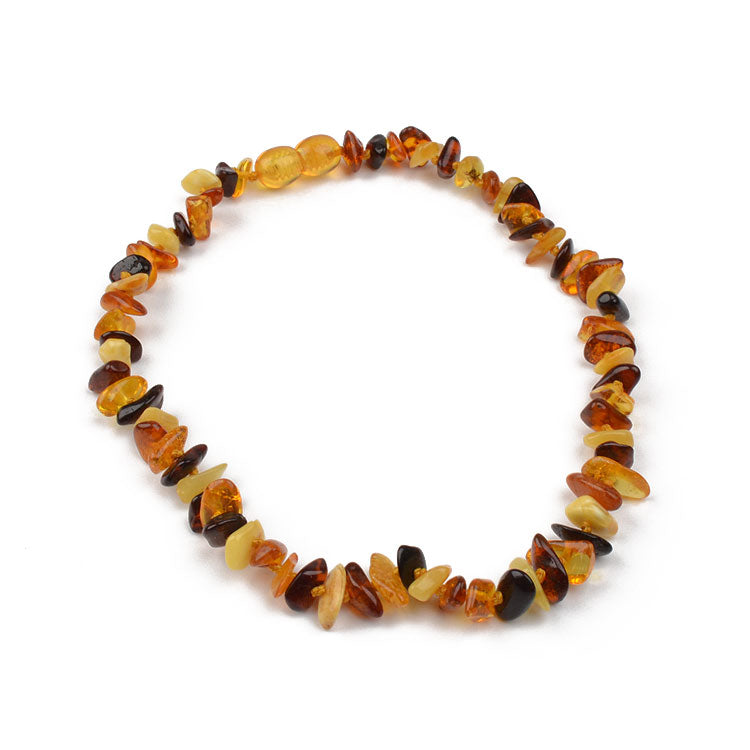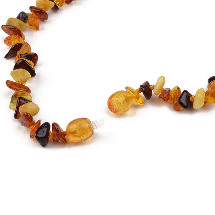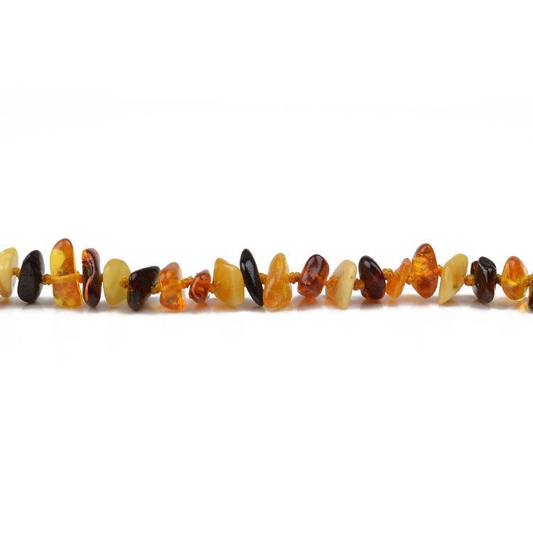 This multi-colored amber necklace for baby is made up of a string of 100% genuine Baltic Sea amber chip beads. Amber has natural acids and oils that produce a analgesic pain reliever when worn against your baby's skin. Amber as a stone warms with wearing, making it a comfort for your baby. Amber is also very lightweight. Amber teething necklaces are not intended to go in your baby's mouth. Hidden barrel clasp and knotted string in-between each and every stone.