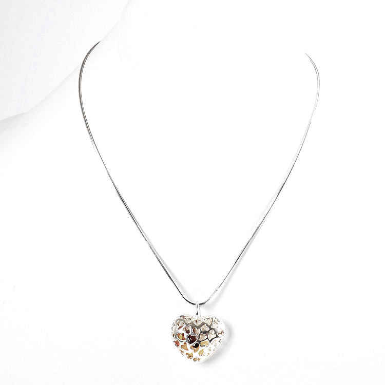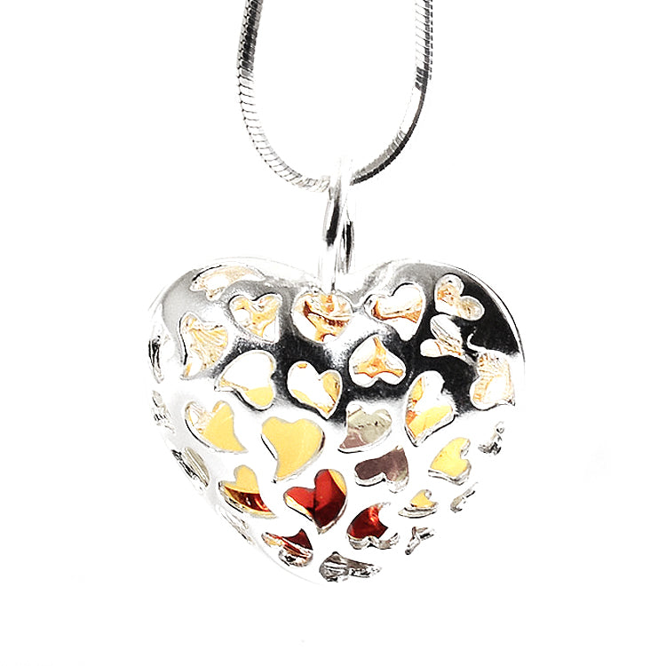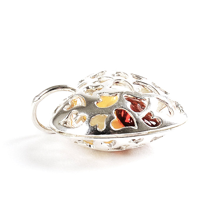 This beautiful and fun pendant made of sterling silver holds little pieces of authentic Baltic amber. The hearts filigree is made up of many stylized hearts in various sizes, allowing the perfect amount of seethrough-ness. The mult-colored amber stones inside make a quiet rattling when the pendant is shaken.