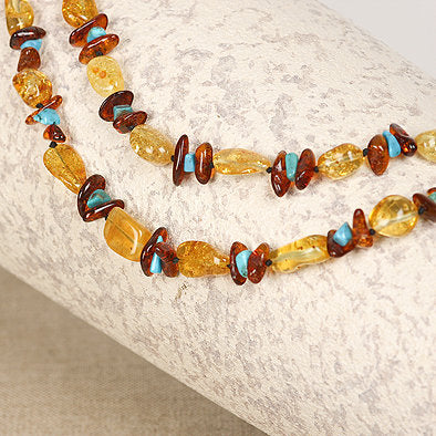 As if the natural honey and cognac colored amber stones on this necklace weren't beautiful enough, our master artisans have thrown in turquoise stones to add the perfect accent. The sky blue turquoise adds a great balance between the honey and cognac Baltic amber, and makes the necklace look simply gorgeous! All of our amber is imported from Russia!