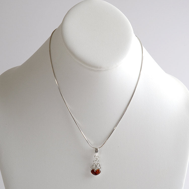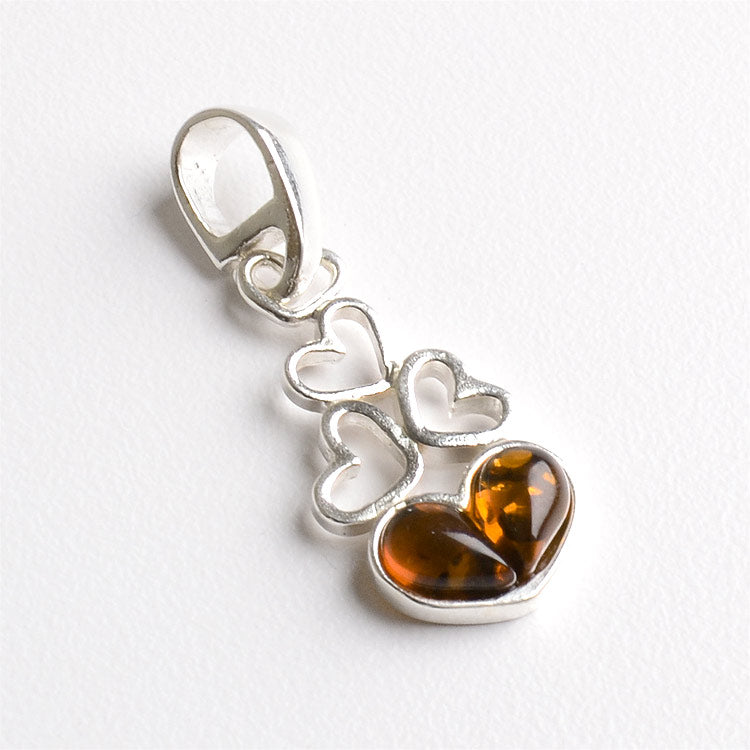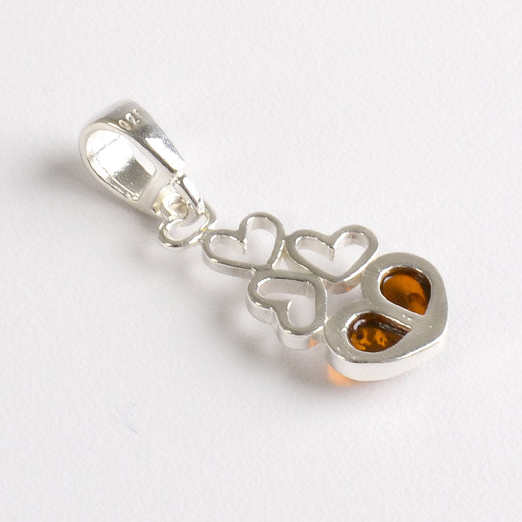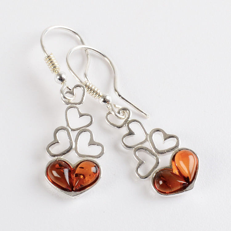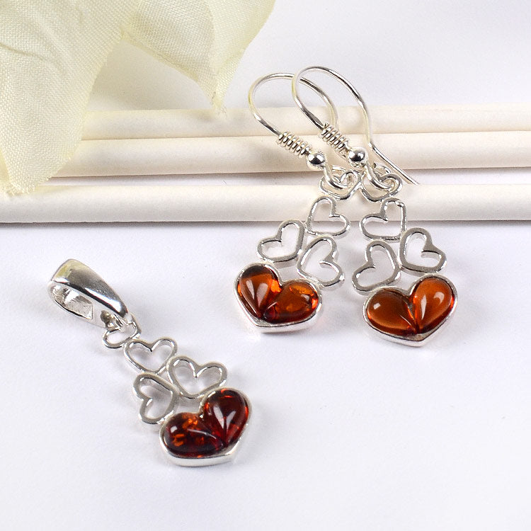 Silver, amber, and hearts will always be stylish and delightful to wear. The pendant and each earring, is made up of four sterling silver hearts, cascading to one Baltic amber stone heart. Simple hooks make the earrings easy to wear everyday.