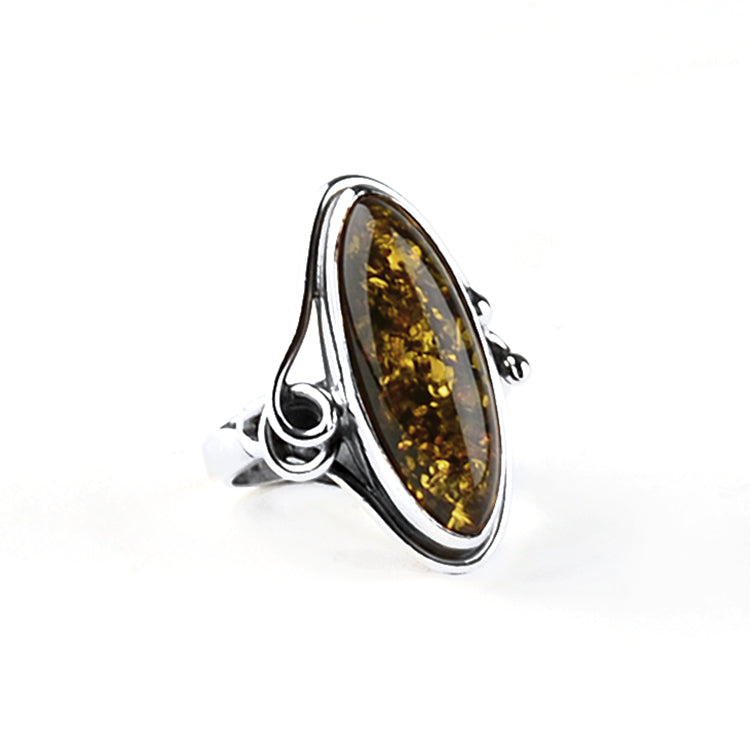 This hand-made green amber ring features an authentic Baltic amber stone situated in a highly stylized sterling silver frame. After being hand selected, the stone was highly polished and set into this custom-made sterling silver setting. With it's rare naturally occurring green amber and many inclusions, this ring really sparkles. This ring is truly one-of-a-kind. The face of the ring measures about 1" long and 1/2" wide. Available in size 7. Pick up your very own green amber ring today!Each piece of our jewelry is hand crafted and each amber stone has its own uniqueness, therefore they might slightly differ from the photograph. Colors of the amber stone/s might slightly vary from its photos. The digital images we display have the most accurate color possible. However, due to differences in computer monitors, there may be variations in color between the actual product and your screen.