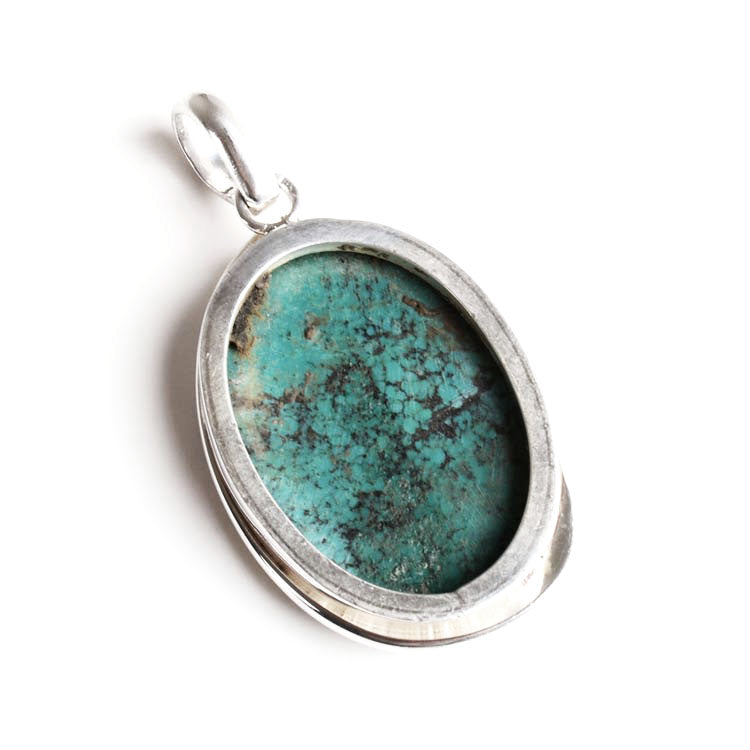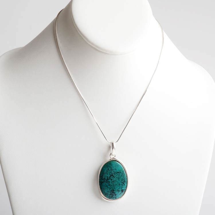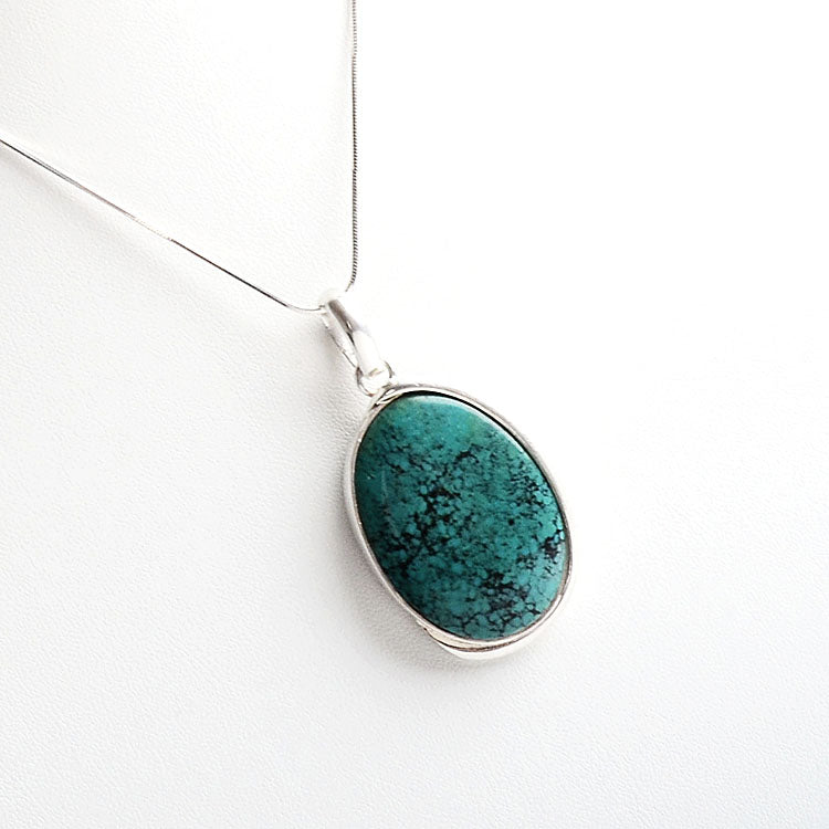 This beautiful oval shaped turquoise pendant is about 2 3/8" x 1 1/16" and sits in sterling .925 silver. A slightly styled edge gives this classic shape a modern touch. A large simple bail allows any chain or rope to easily slide through. Anyone would be happy to have this piece of jewelry in their personal collection!
