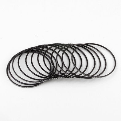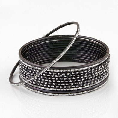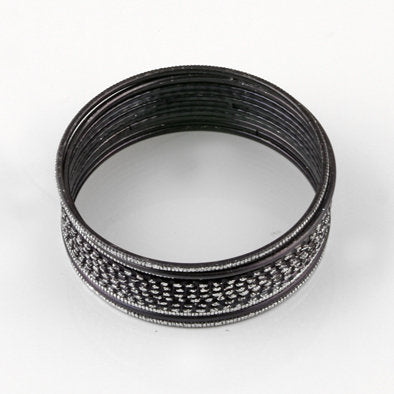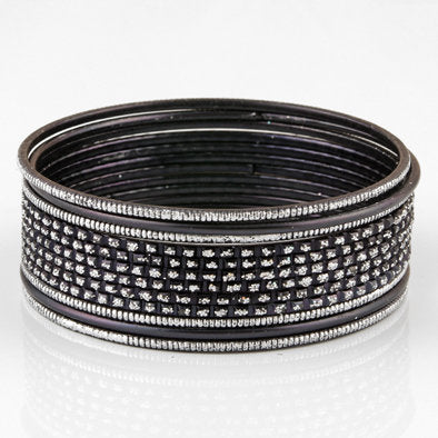 Wear this set of glittering black bangle bracelets Mixed with silver jewelry to add a bit of variety to your ensemble. six bangles feature a checkered glitter design, four feature silver highlighted ribs, and two are solid black. Comes with 12 bangles.