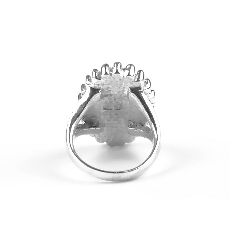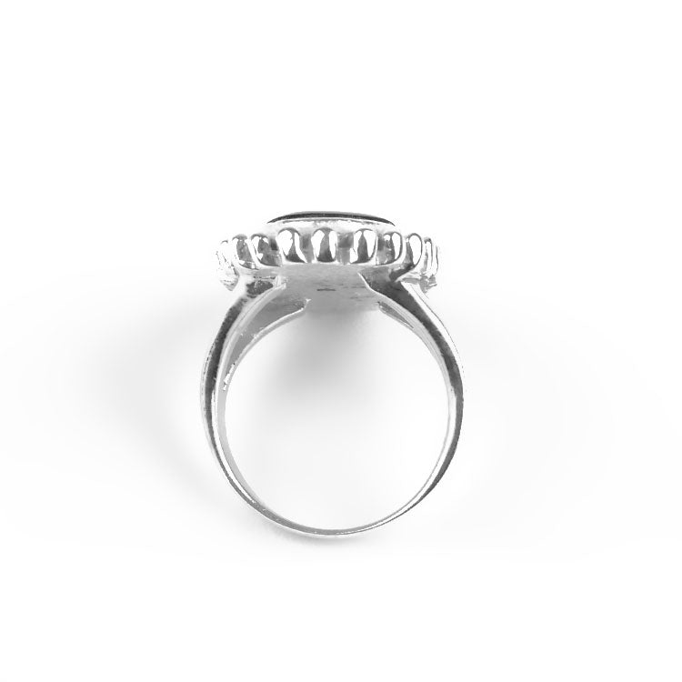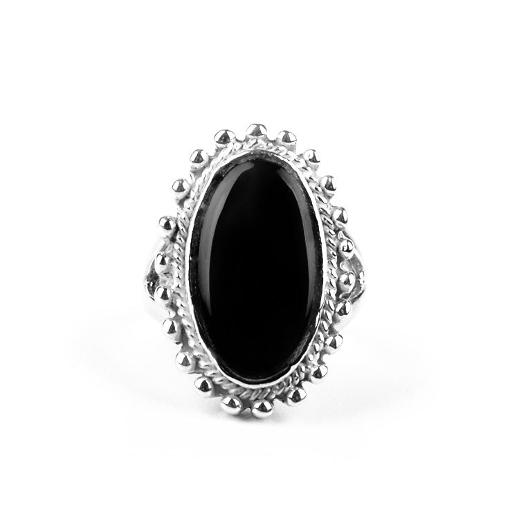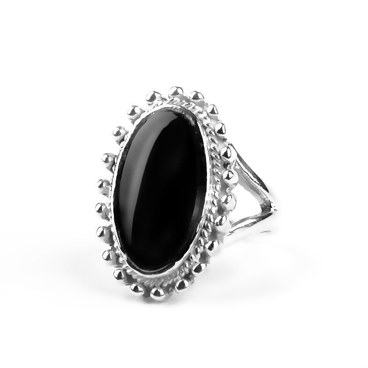 This bold ring features an oval-shaped black onyx gemstone that is smooth, flat, and approximately 3/4" long and 7/16" wide. Surrounding the black gem is a sterling silver rope and balls design, making this ring a bit more exciting and fashionable. The entire face of the ring is 1" long and 5/8" wide.