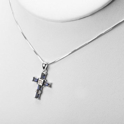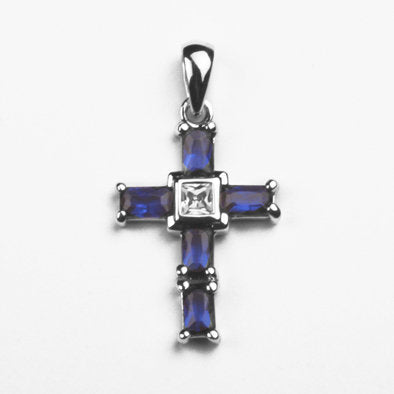 This great piece of religious jewelry features five blue crystals and one white crystal set in sterling silver. The pendant is in the shape of a cross which measures 1 1/8" in length by 9/16" in width.