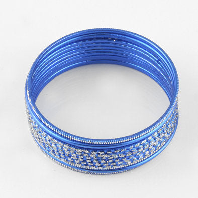 Wear this set of glittering blue bangle bracelets Mixed with silver jewelry to add a bit of color to your ensemble. six bangles feature a checkered glitter design, four feature silver highlighted ribs, and two are solid blue. Comes with 12 bangles.