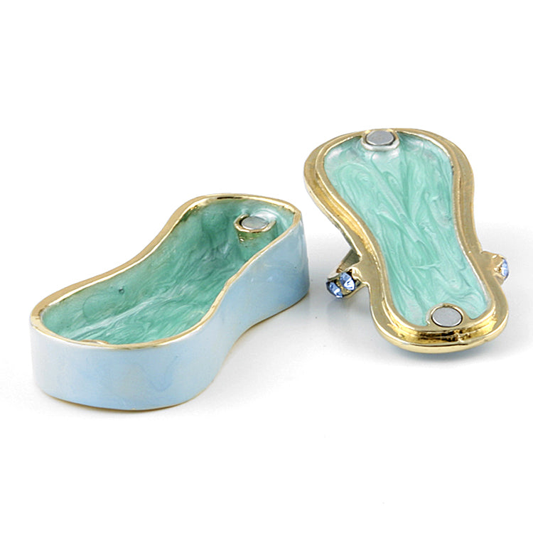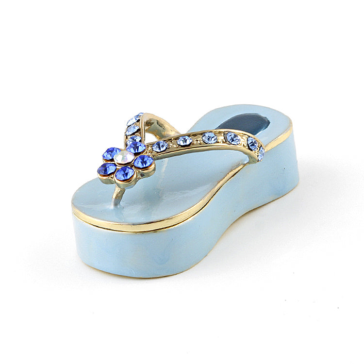 This one-of-a-kind and fun trinket box is a great display item, or just perfect for holding those very small items that are so hard to keep track of. Put it on your mantle or keep it on your desk. The box features gold-plated trim, and a collection of hand-placed Austrian crystals. The box is hand-painted by artisans using a thick enamel-like paint. The top of this box is removable thanks to a magnetic clasp which closes securely. This sandal box comes in its own satin-lined gift box.