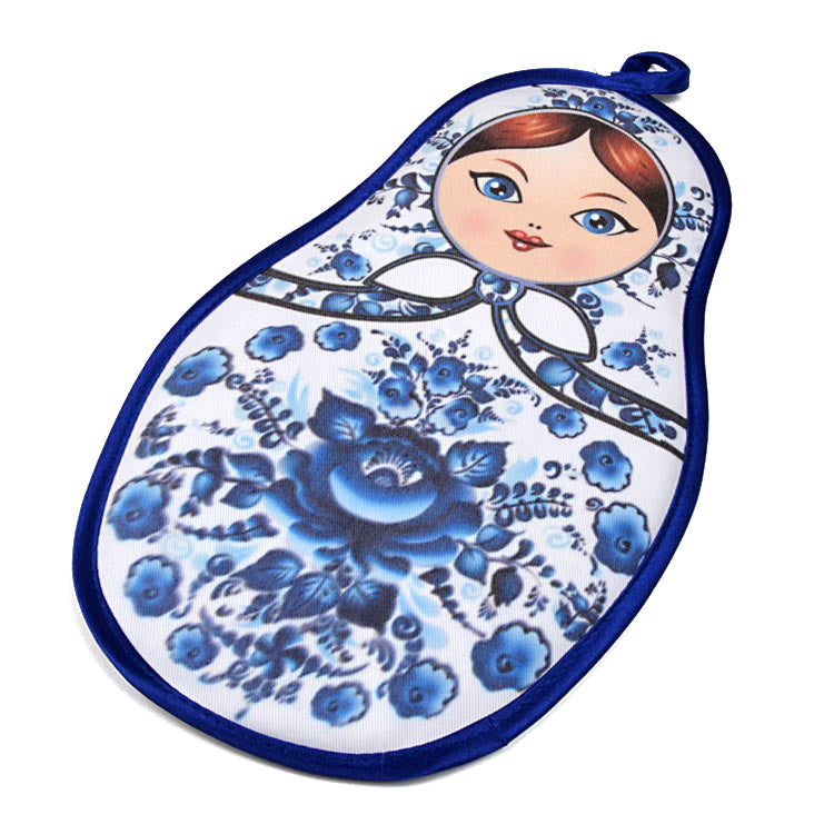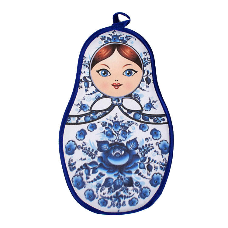 This Gzhel-inspired blue floral matryoshka pot-holder Kitchen accessory is a hang-able and Approximately 11" x 7" in size. It is sure to delight anyone who loves Russian nesting dolls, and is a fun addition to any kitchen!