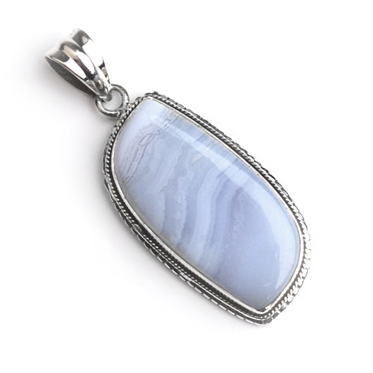 This blue lace agate pendant offers the most intriguing fashion looks. It is set in a framework of sterling silver. Its large cabochon is a prime example of fine world gemstones. This beautiful piece was carefully hand-carved and polished to bring out its inherent beauty.
