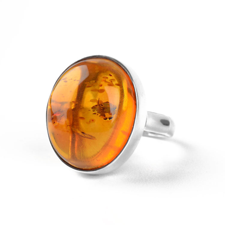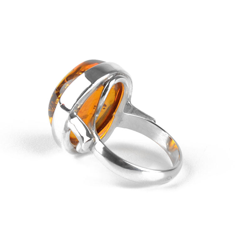 This bold and beautiful honey amber ring is quite an eye-catcher. The real Russian amber stone is approximately 3/4" x 3/4" in size and it is set in sterling .925 silver. This fairly large ring is styled in a way that it sits high off the finger, which helps the amber glow due to the light that can pass through it. This is a truly impressive piece of jewelry! Size 9 ring.