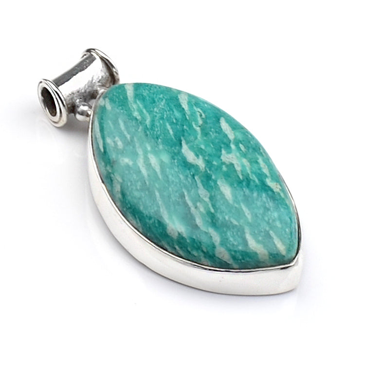 SOLD AS IS (there is small dent on the side of the frame). Price cut more than in half: was $123.99, now is $59.99. This rare amazonite pendant/slider offers the most intriguing fashion look. It is set in a framework of sterling silver. Its large cabochon that measures 1 1/16" x 7/8" is a prime example of fine world gemstones. This beautiful piece was carefully hand-carved and polished to bring out its inherent beauty.