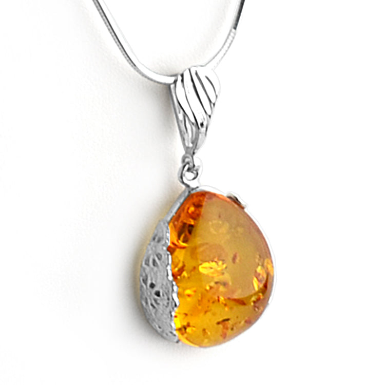 This modern and chunky amber pendant features one large nugget of bright honey amber with many glittering natural inclusions. Adorned by silver lace on one side. This pendant is the perfect combination of timeless design and modern appeal. This pendant will never go out of style and is sure to be cherished from generation to generation. The sterling silver complements the stone, as well as the intricate bail. Each piece is hand-crafted, therefore they are slightly vary in design and size.