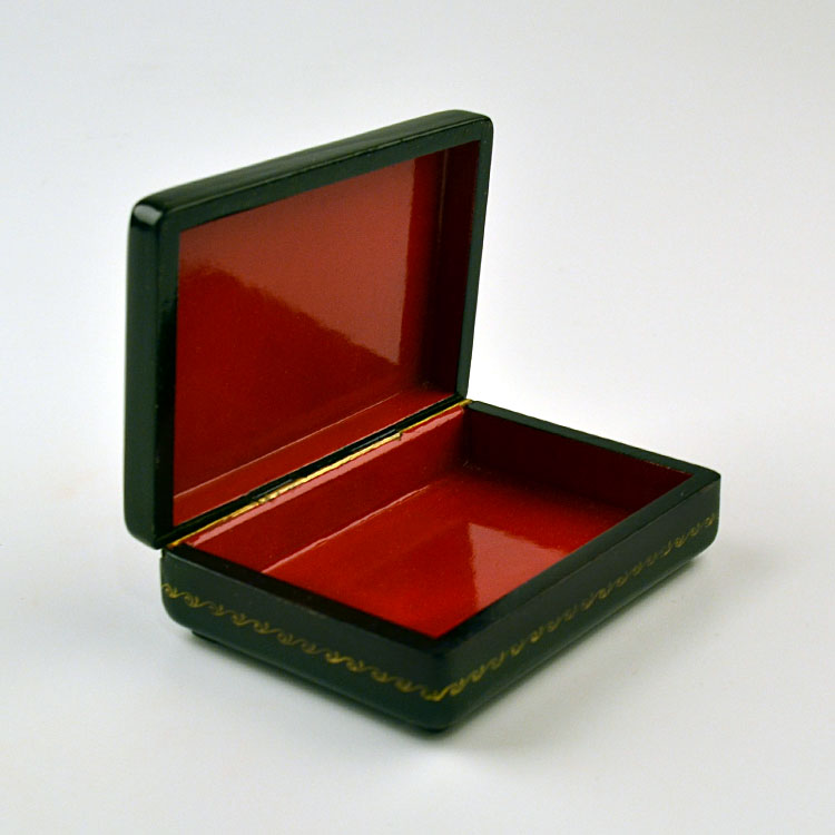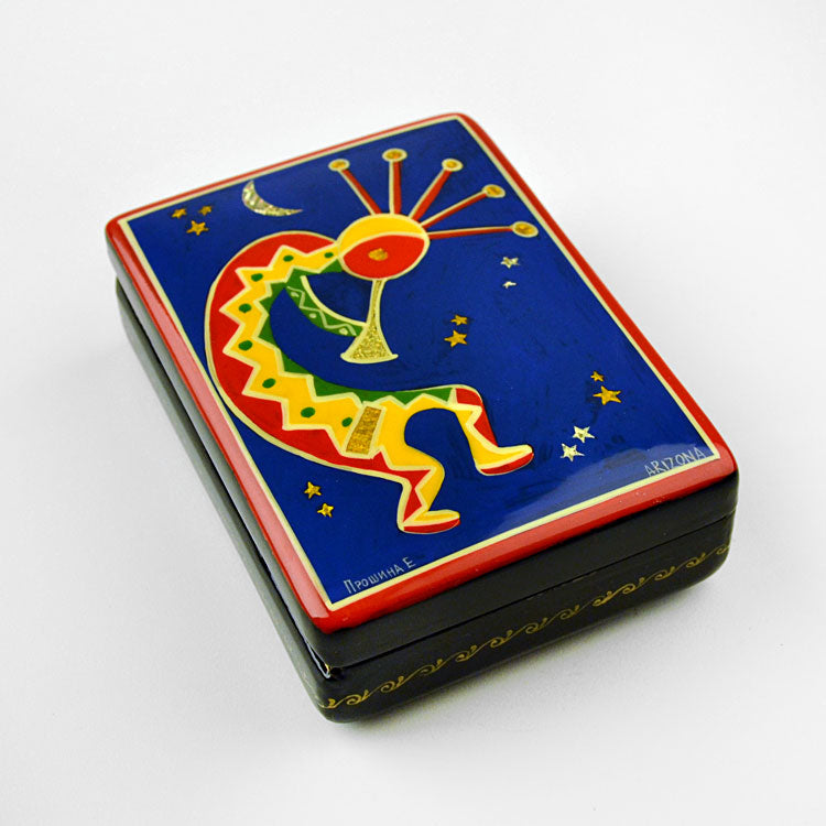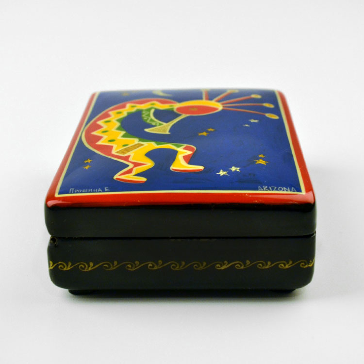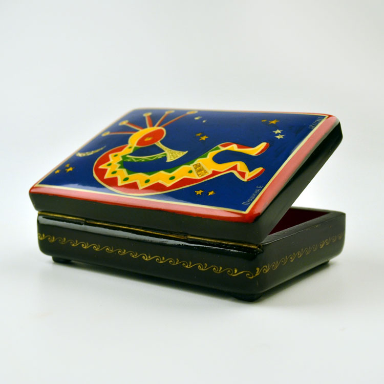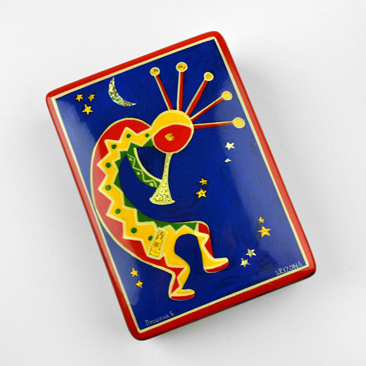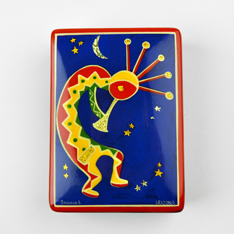 A bright kokopelli (Hunch-backed, flute playing fertility Gods in Native American culture) decorates this Russian-made lacquered box, found extraclusively here at The Russian Store. Features vibrant hues and areas with sparkles. Makes a unique gift! About 4 1/4" x 3 1/4" in size, with a depth of about 1".