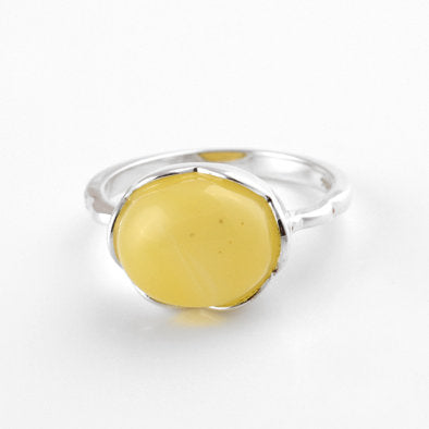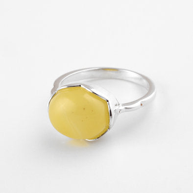 This comely ring features a cabochon butterscotch amber oval, set in .925 sterling silver. Silver has been edged into a wavy cutout, and the silver band echoes the waves with small bump embellishments, giving the classic oval stone a fun setting.