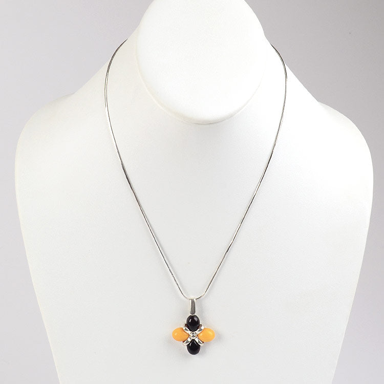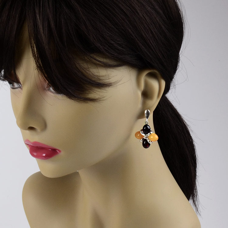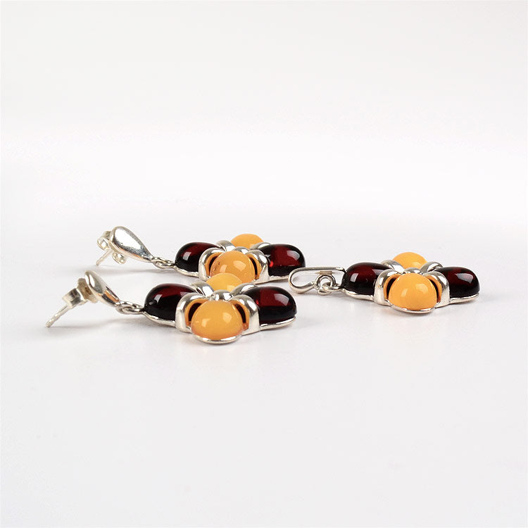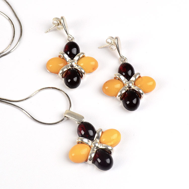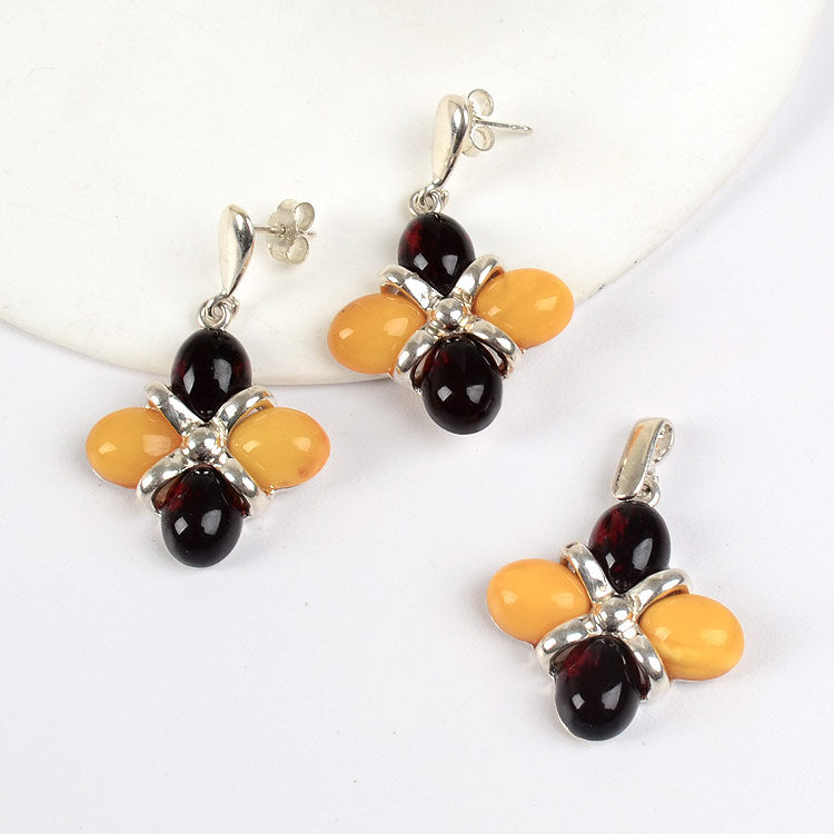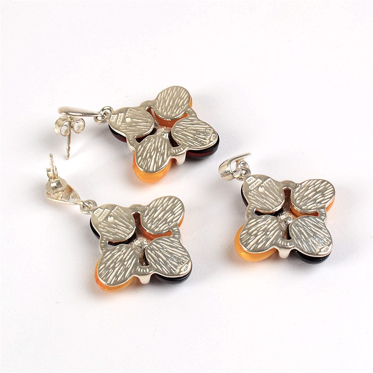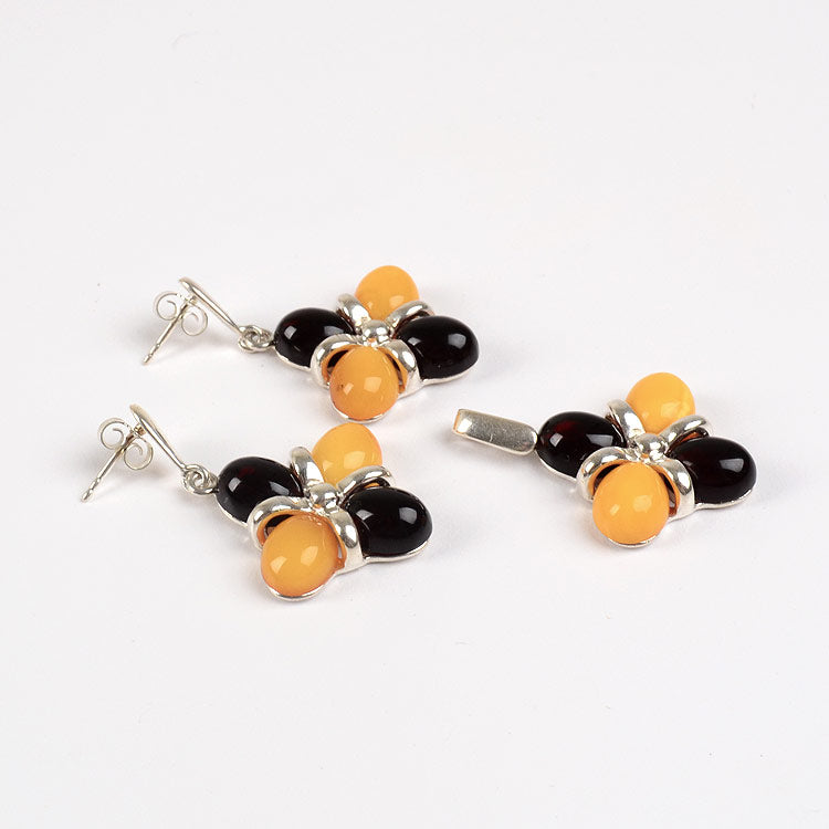 This unique and very rare multi-color amber jewelry set is a wonderful display of Russian artwork. It is a 3 piece set: pendant and earrings. It features beautiful butterscotch and cherry colored amber stones. The pendant measures 1 1/2" x 1", and the earrings are 1 1/2" long each.