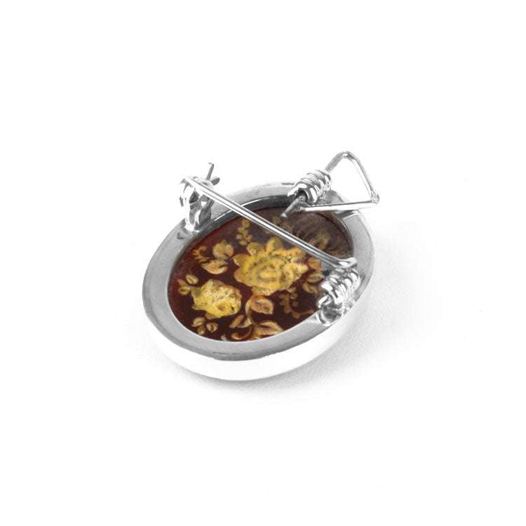 Two pieces of jewelry in one! This 1 1/4" long, 1" wide carved amber in silver pin is also a pendant for a necklace. Wear it either way and enjoy the prettiness of authentic amber. This intaglio amber was made entirely by hand; any imperfections should be considered artistic beauty, however we have reduced the price greatly for such imperfections.
