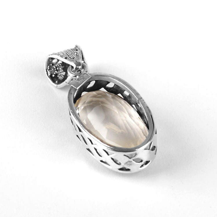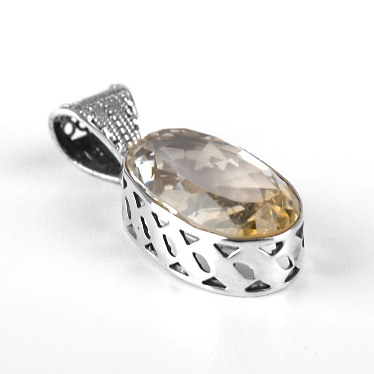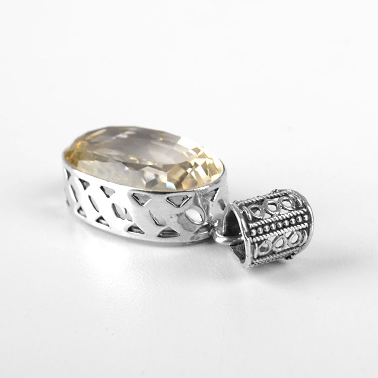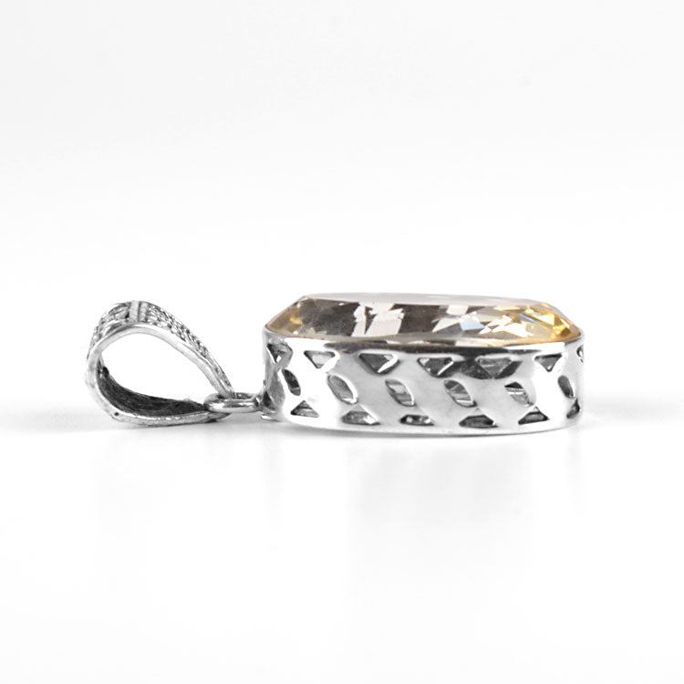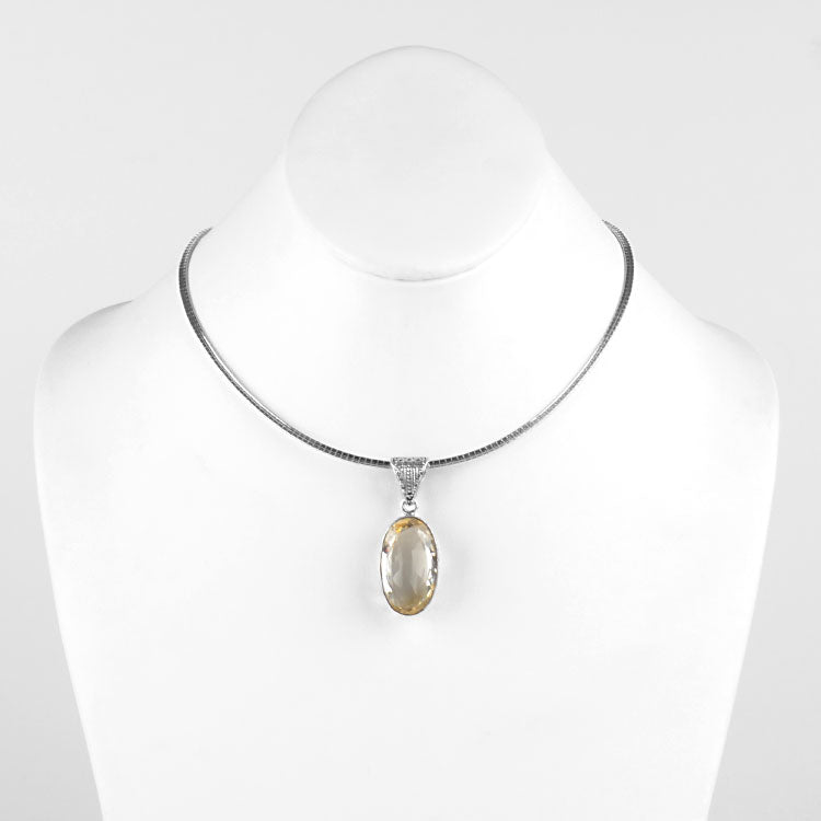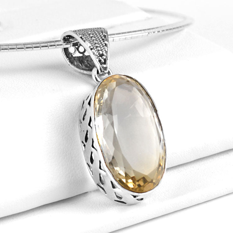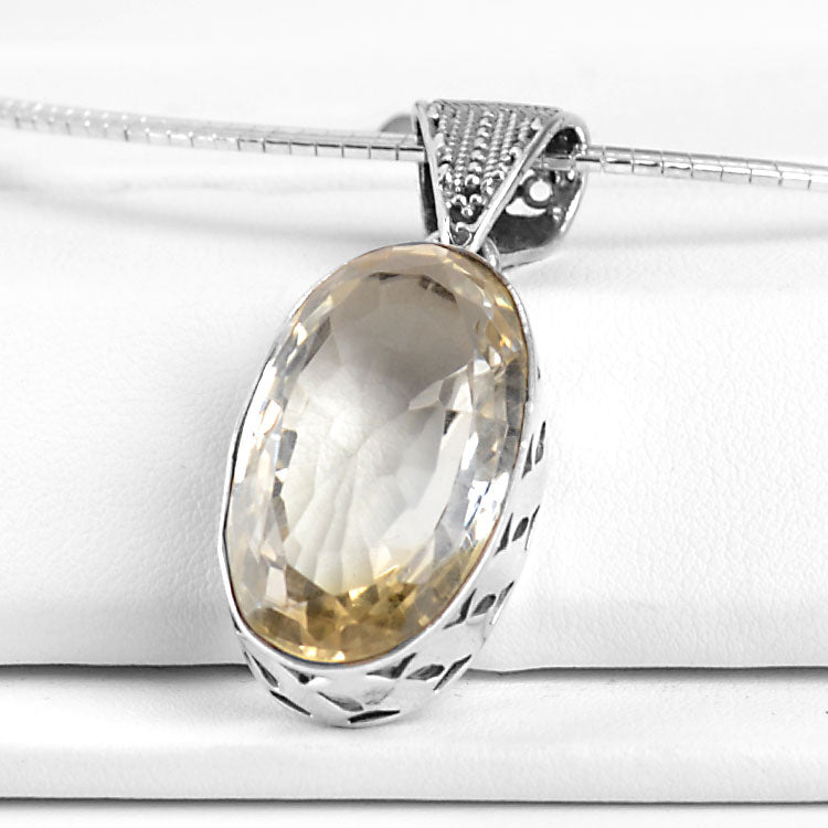 Add this almost-clear citrine yellow quartz pendant to your wardrobe for a unique way to wear crystal gemstones fashionably! This large pendant (about 1 3/4" total length) is ideal for just about anyone. The oval gemstone has been faceted so that every way you look at it, you see different areas of sparkle. Set in 1/4" thick, stylized sterling .925 silver and finished off with a detailed bail.