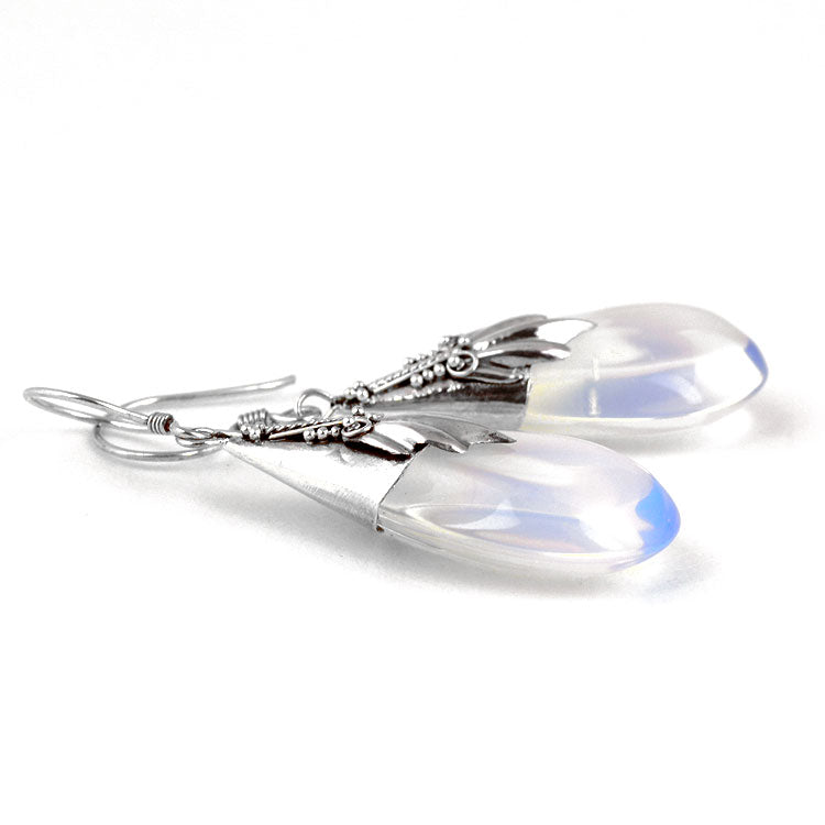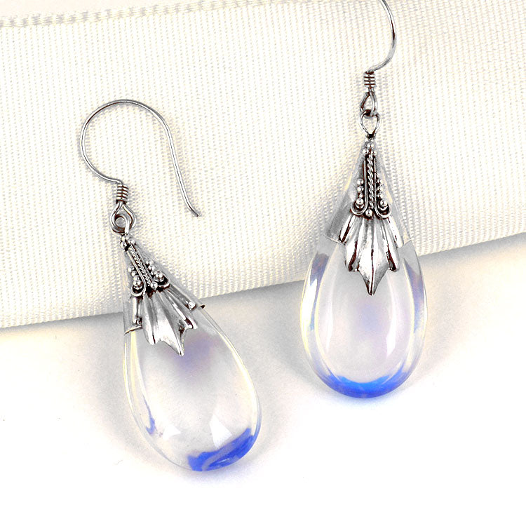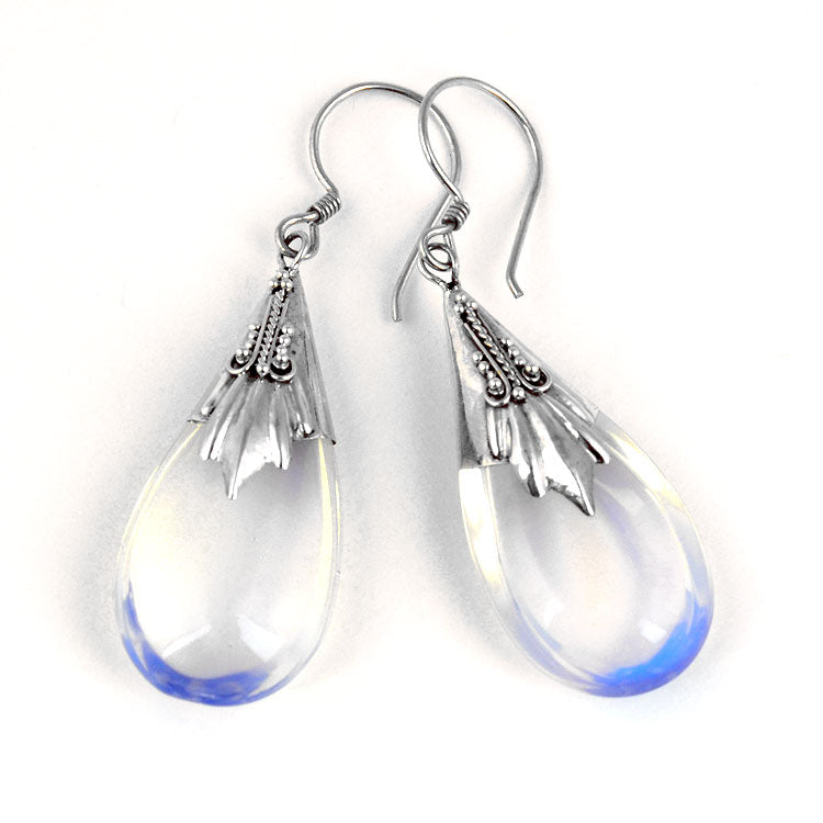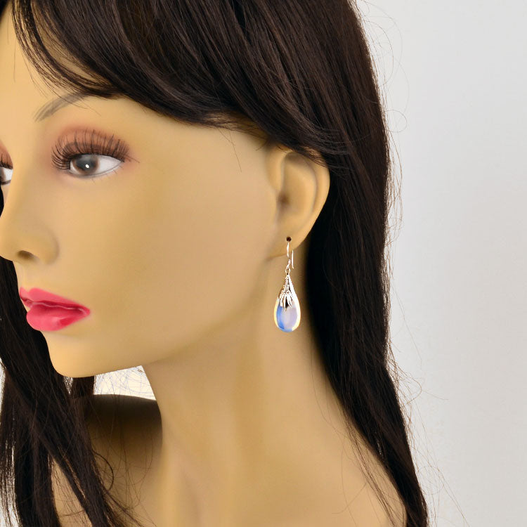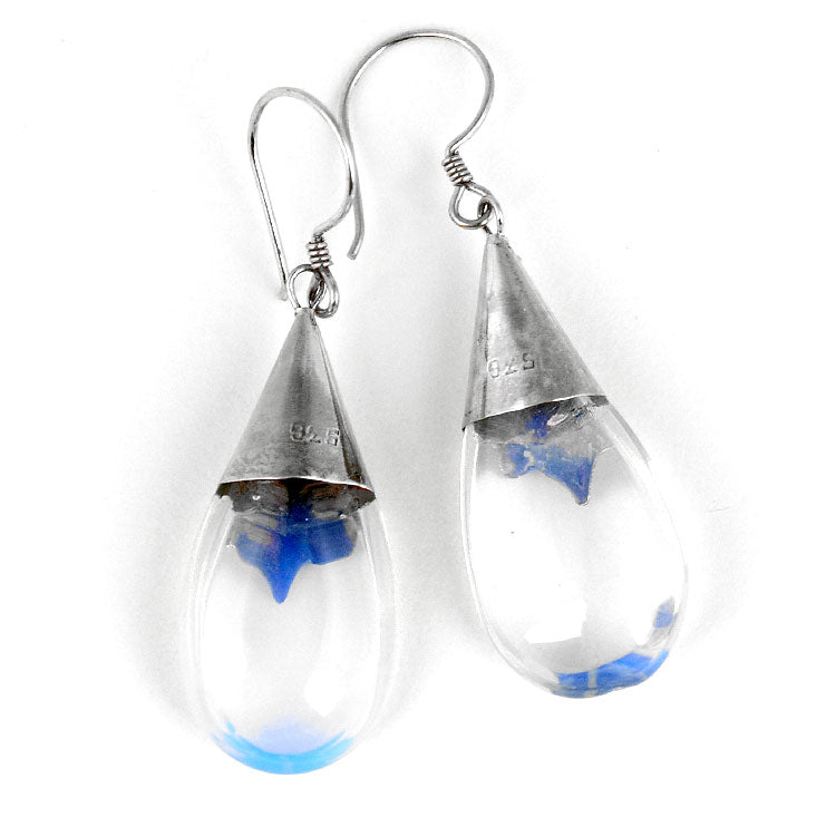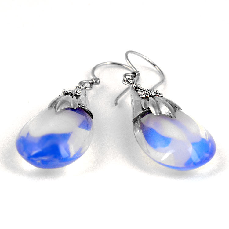 These semi-clear / slightly blue earrings are a perfect match for most any occasion. The earrings feature .925 sterling silver design containing "leaves" and "dots." Simple hooks allow for easy wear or everyday wear. Total length of earring is Approximately 2 3/4" and about 1/2" wide.