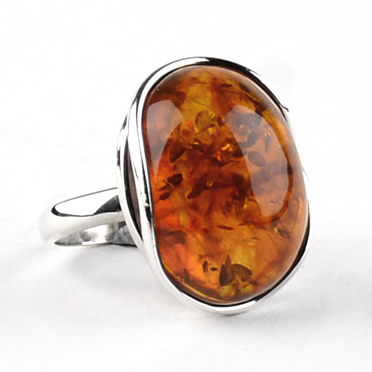 This Cognac Baltic Amber Silver Ring is perfect for everyday wear, featuring large genuine Baltic cognac color amber oval shape cabochon. The face of the ring measures about 1" long and 3/4" wide. The size of the ring is adjustable and could fit finger size from 8 to 9. The amber comes from the Baltic regions in Russia. This classic ring is fashionable and can be worn with any outfit.Each piece of our jewelry is hand crafted and each amber stone has its own uniqueness, therefore they might slightly differ from the photograph. Colors of the amber stone/s might slightly vary from its photos. The digital images we display have the most accurate color possible. However, due to differences in computer monitors, there may be variations in color between the actual product and your screen.