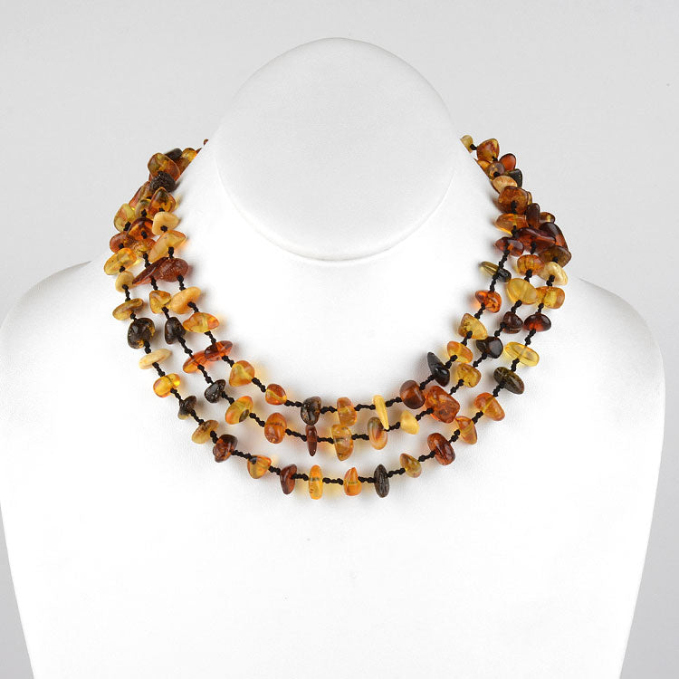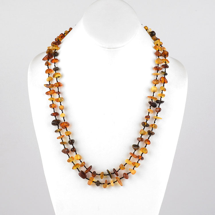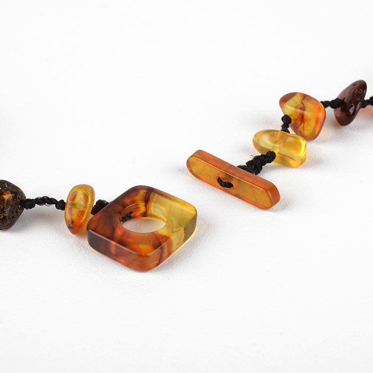This long, lightweight, colorful, and fun necklace features small authentic amber nuggets, hand-strung with two knots in between each bead. Each piece of amber contains its own unique beauty; some are very clear, some are opaque, others have bright inclusions, and some have natural lines and blemishes. A toggle bar closure completes this wonderful neck jewelry, which can be worn a variety of ways.