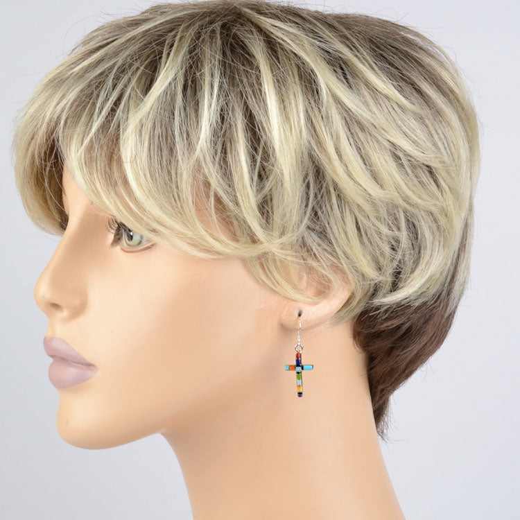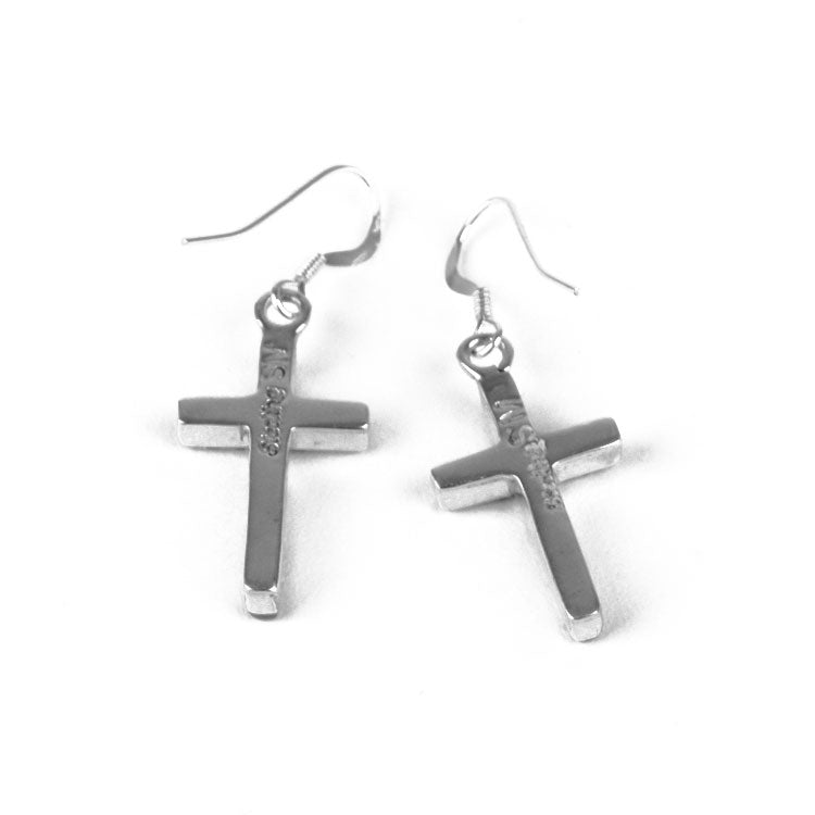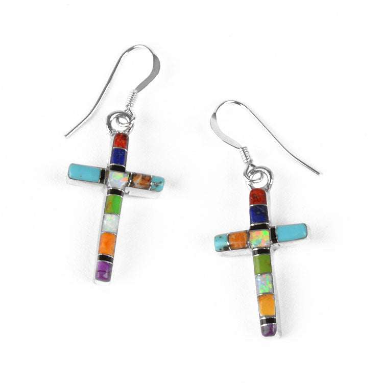 These colorful cross earrings are a beautiful way to show one's religion. Each 1 1/2" long earring features a variety of gemstones, including turquoise, opal, spiny oyster, sugilite, and more. The crosses are each about 7/8" x 1/2" in size. Made with sterling .925 silver.