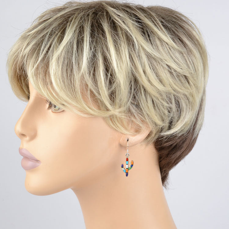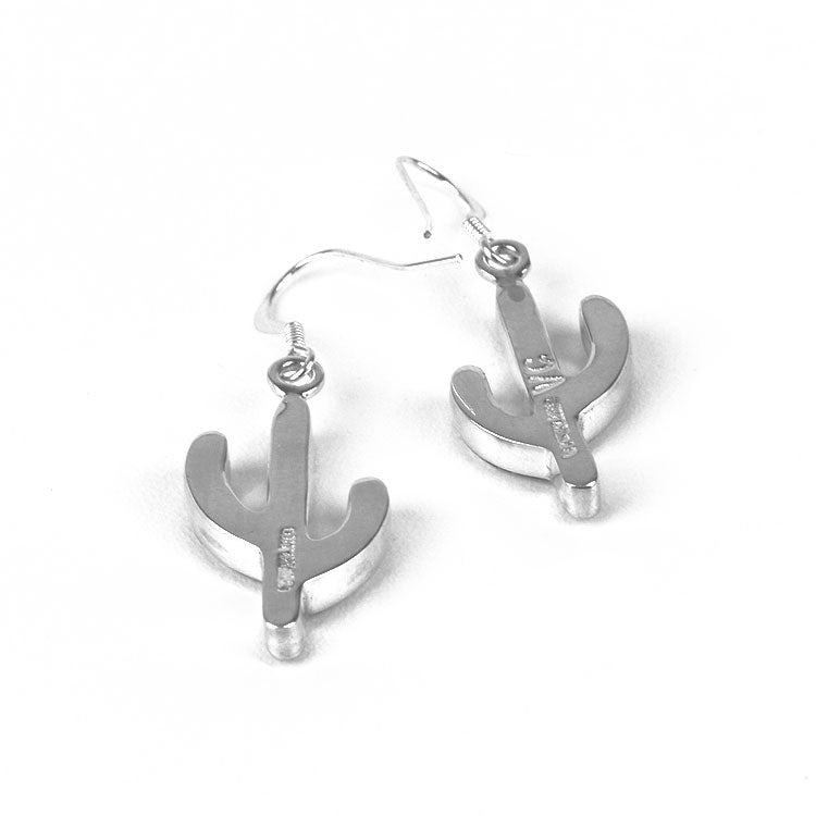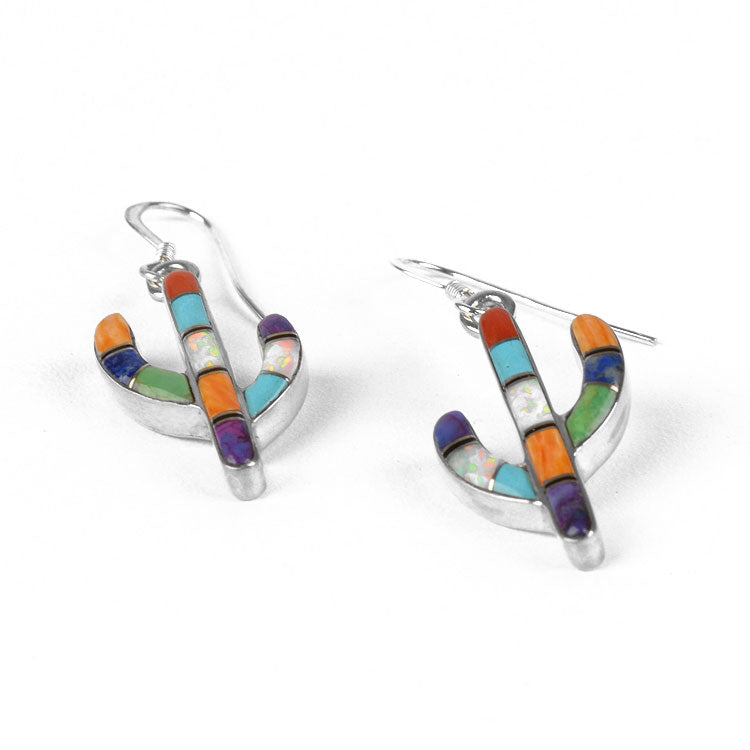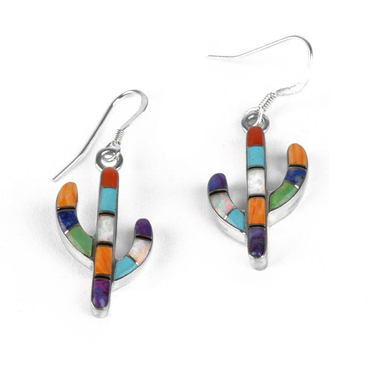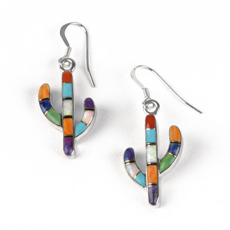 These unique desert Saguaro cactus earrings are made up of a variety of colorful gemstones, including turquoise, spiny oyster shell, opal, lapis lazuli, and sugilite. The natural gems are inlaid into sterling .925 silver. The 1 1/2" long Southwest design earrings have simple hooks. The cacti are each about 7/8" x 1/2" in size.