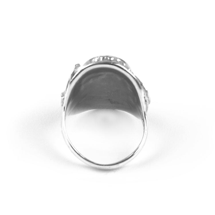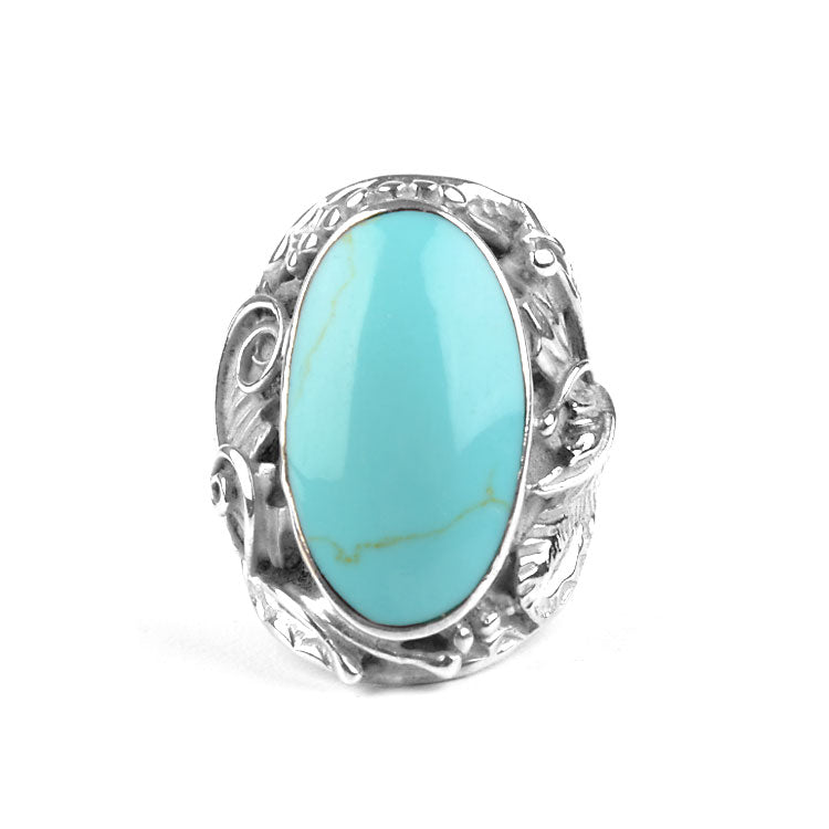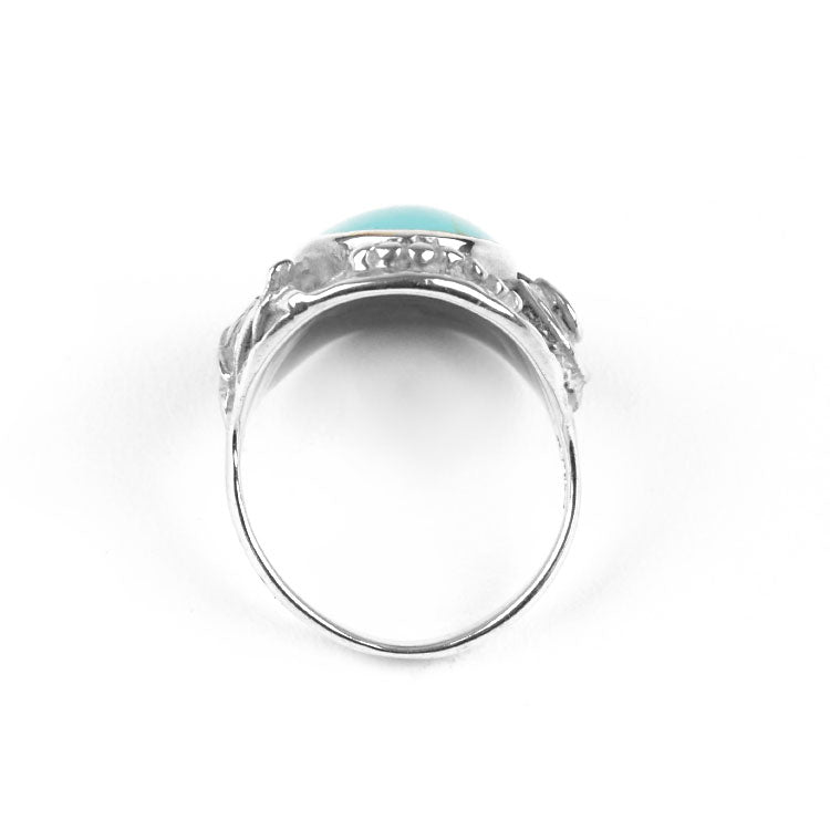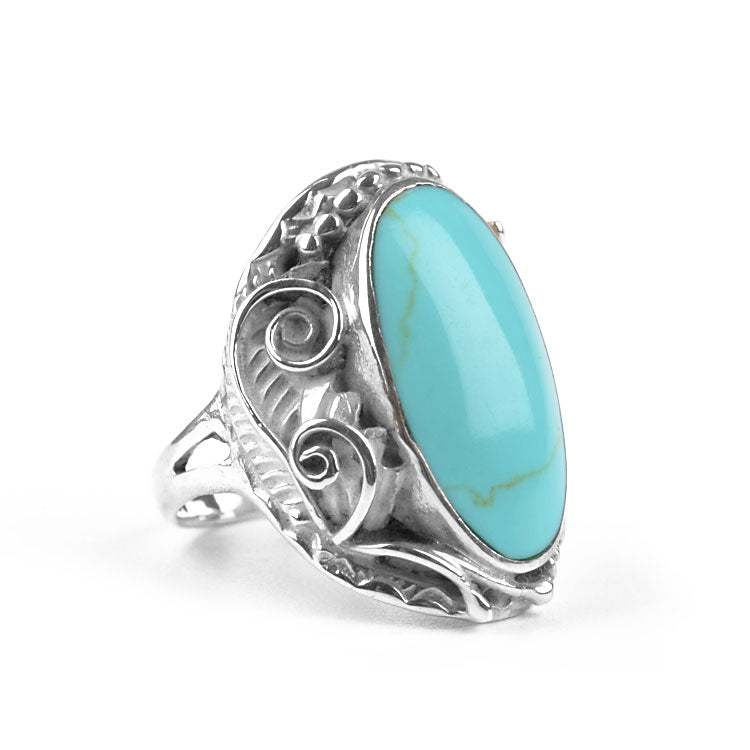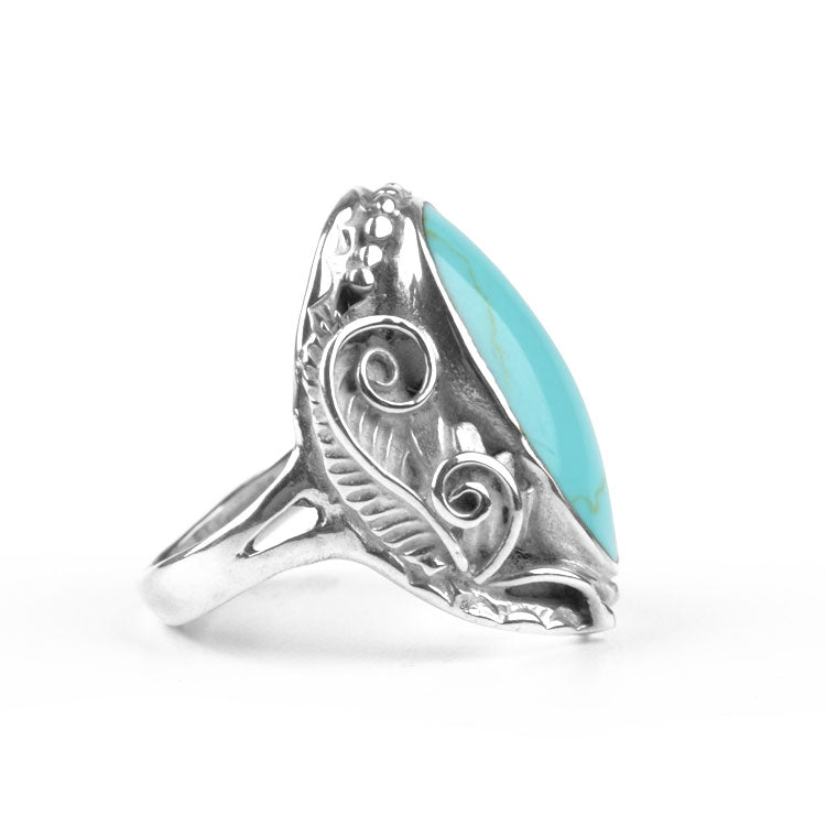 This exquisite turquoise ring is extra comfortable; the silver backing is smooth and curved for a nice feel on the finger. In the center of this 1 1/8" long ring there is an authentic turquoise stone, approximately 7/8" long and 1/2" wide. Surrounding the blueish gemstone is a detailed foliage of leaves, swirls, and balls. This handcrafted ring is sure to become a favorite piece of jewelry to the owner!