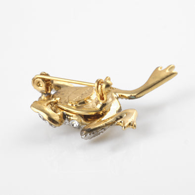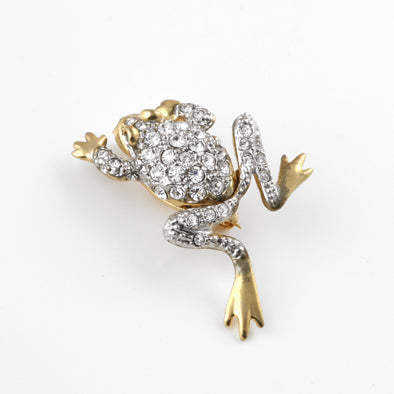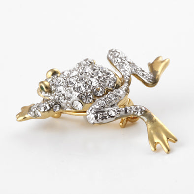 Watch as this glittering gold-tone frog pin dances to your movements! Encrusted with glittering white Austrian crystals, the frog's leaping back legs swing freely back and forth, adding a unique touch of movement to this cute frog brooch.