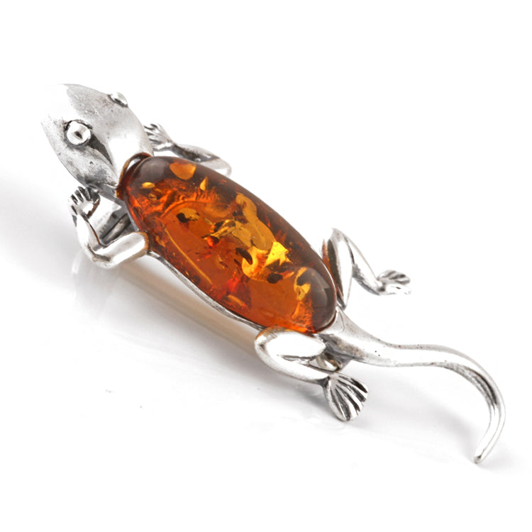 This cute gecko / lizard pin features a honey amber marquise with unique natural inclusions. The brooch consists of a honey amber body set in a .925 sterling silver lizard head, legs, and tail.