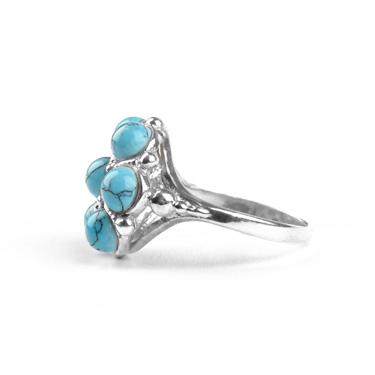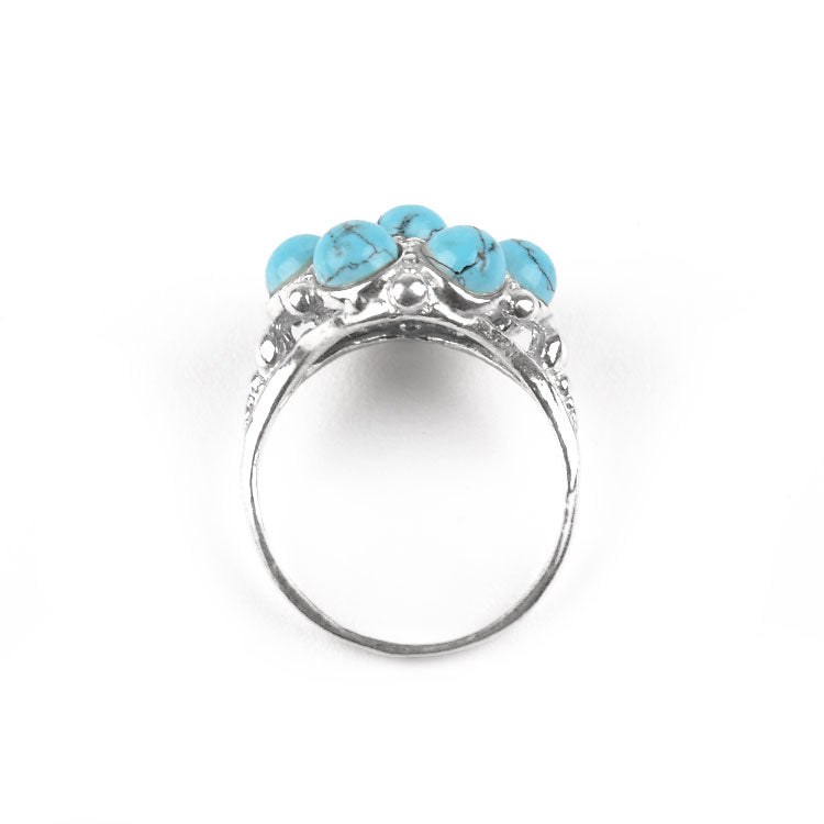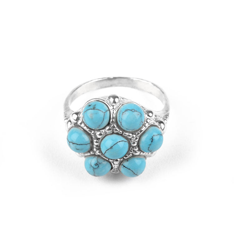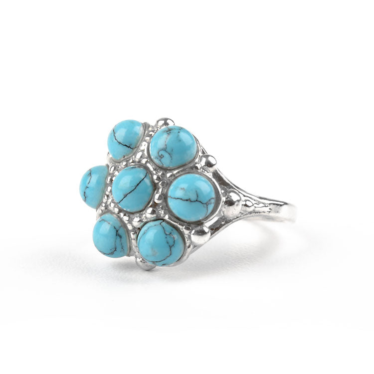 This super-cute and very comfortable size 7.5 ring is made up of seven balls of natural turquoise, situated in stylized sterling silver and arranged in a flower-like design. This turquoise ring is one that could easily become a favorite piece of jewelry to wear everyday. Gemstone balls are about 3/16" in diameter; entire ring face is about 5/8" in diameter.