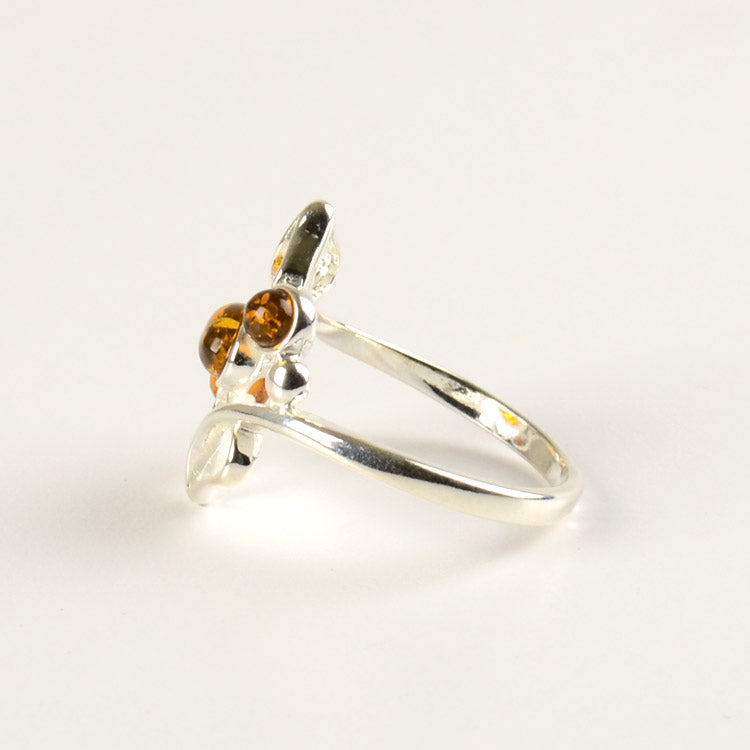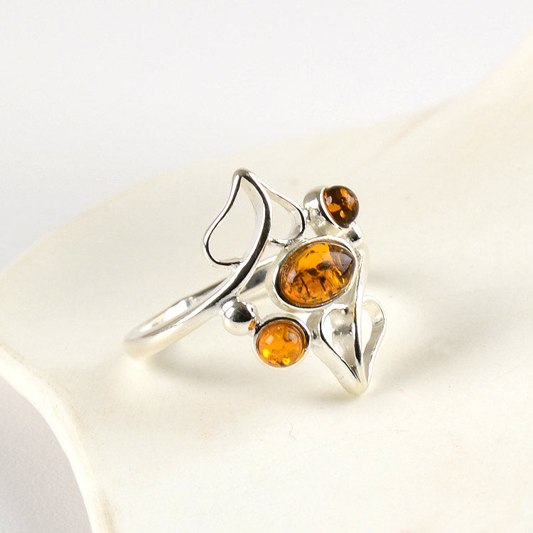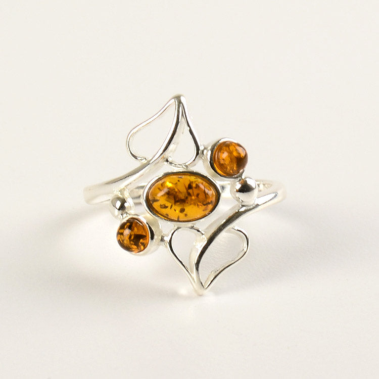 This lovely ring consists of three amber stones set in sterling .925 silver. The silver has been shaped into two hearts and designed to look good as well as be comfortable to wear. This delicate heart amber ring is available in size 8 1/2.