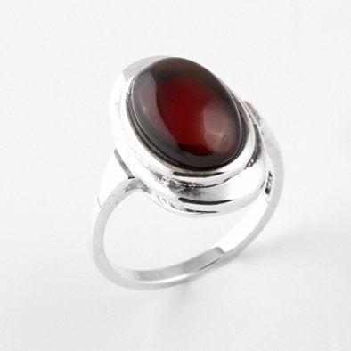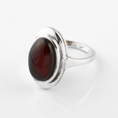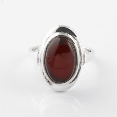 This elegant ring features a large cherry amber oval set in an elongated .925 sterling silver oval, slightly raised from the simple sterling silver band to allow the natural beauty of amber to shine through the rich red color.