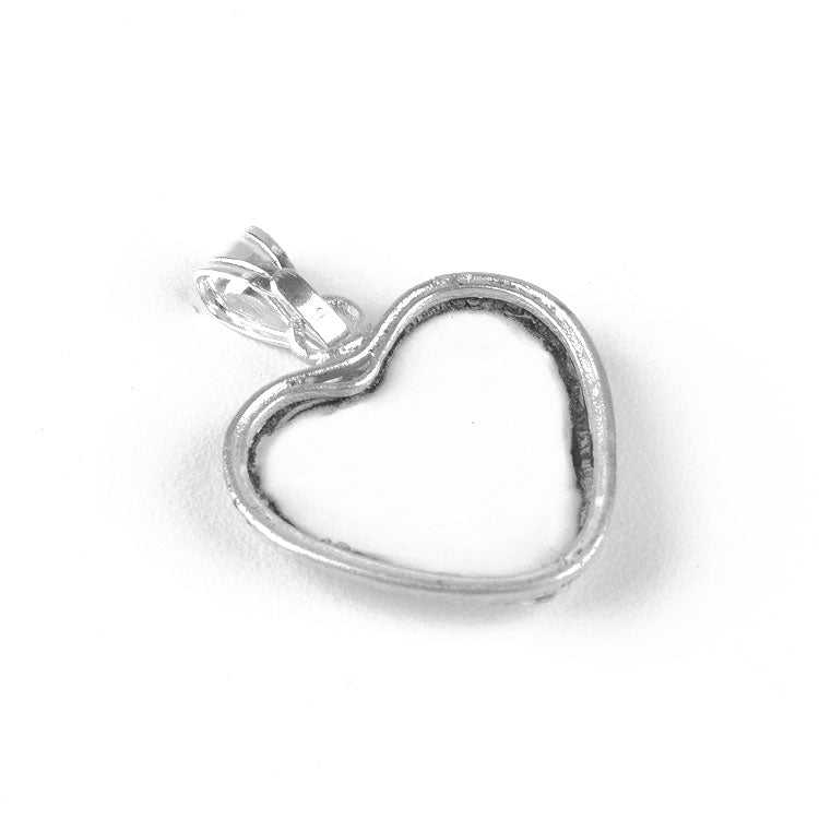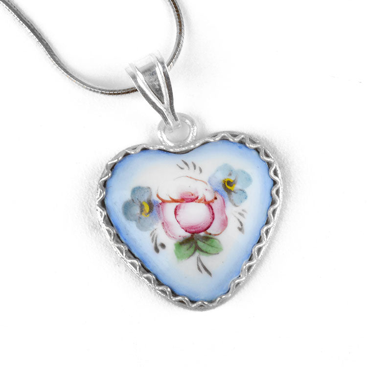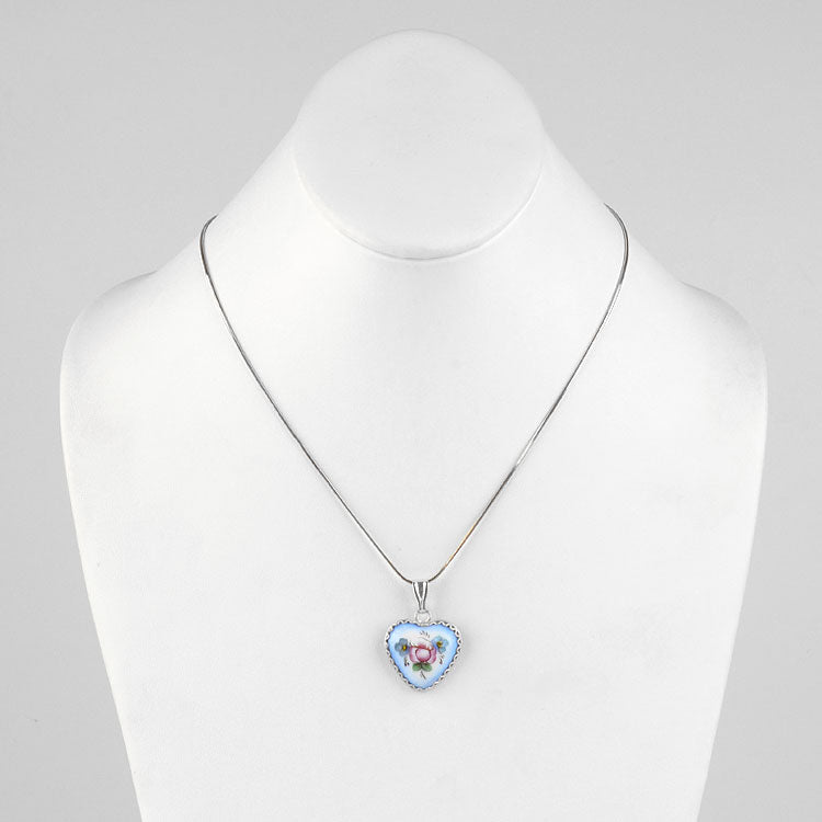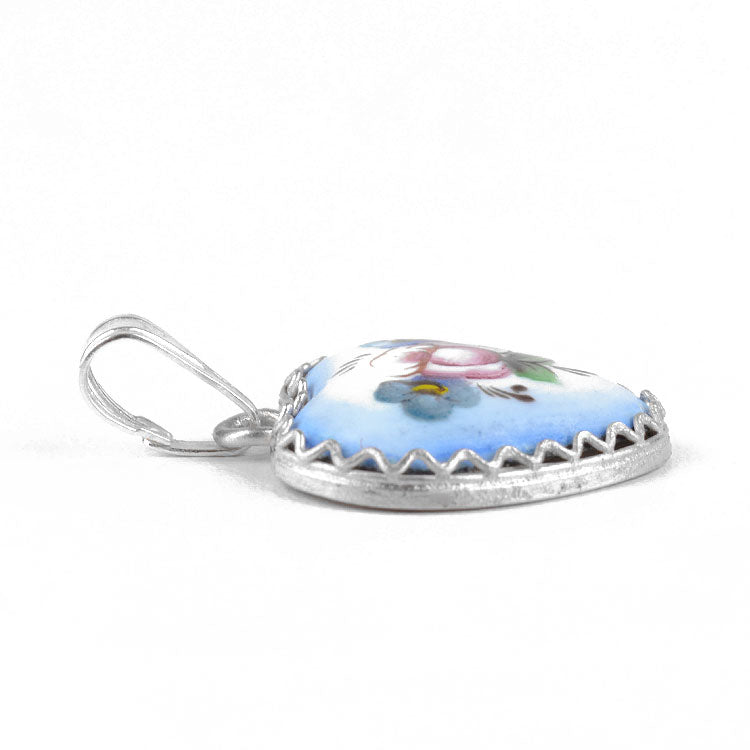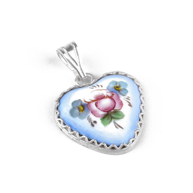 This heart-shaped pendant is made of traditional Russian Finift Enamel and fine German Silver and features a floral design against a light blue background. Lightweight and approximately 1 1/4" total length and nearly 1" wide. Hand crafted in Russia. Chain not included.