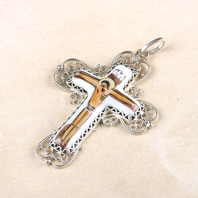This finift Crucifix is very elegantly painted with unique miniature painting technique. On the back of the Crucifix there is a written a prayer: “Save and Protect."