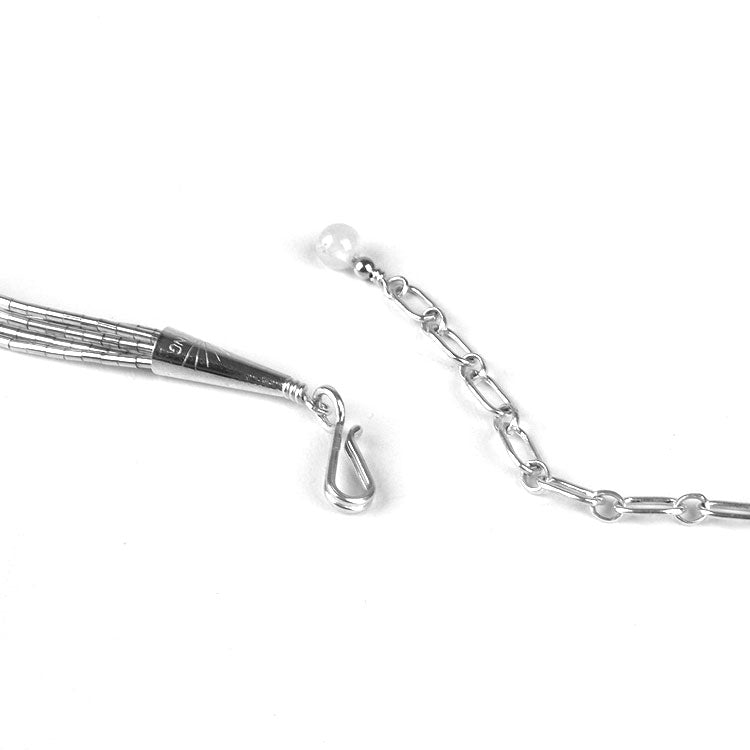 This lovely white quartz in liquid silver necklace is something that will never go out of style. The design of the many small silver beads and the white quartz round beads is classic and the grey-tone of this necklace means it will go with everything. This particular necklace looks great dressed-up or down. It is 23" long with a 1 1/2" extension. The many tiny silver tube beads that make up the liquid look are each about 1/16" in size.
