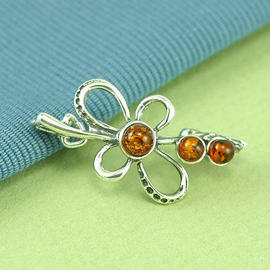 This abstract floral honey amber brooch is set in a framework of sterling silver. Its design consists of three sparkling amber beads.
