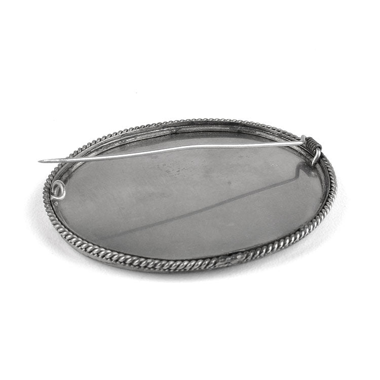 This bouquet of beautiful painted flowers was done in Russia, Fedoskino style. It is made of a mother of pearl base that is nested into a German silver frame with a pin on the back. Each brooch is painted in the classical Fedoskino style. Fedoskino is the famous Russian school of miniature painting. This pin is sure to complete that special outfit.