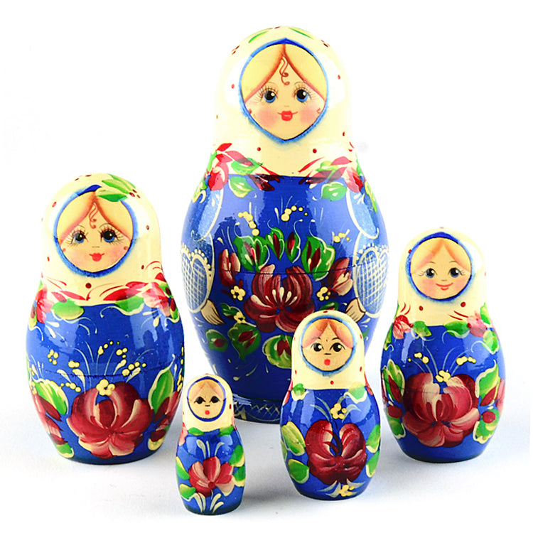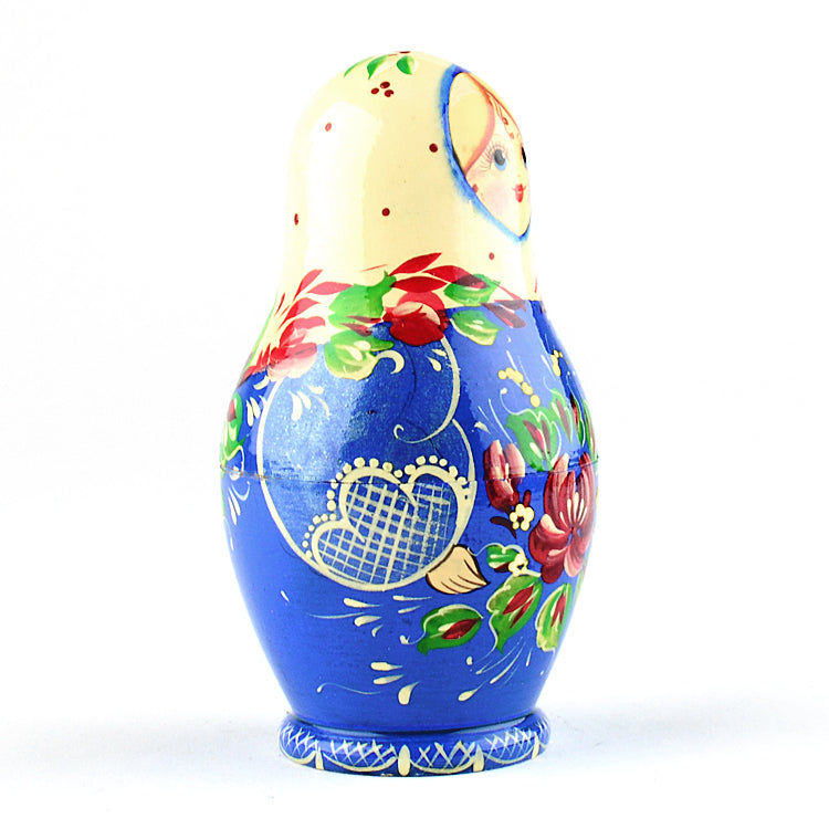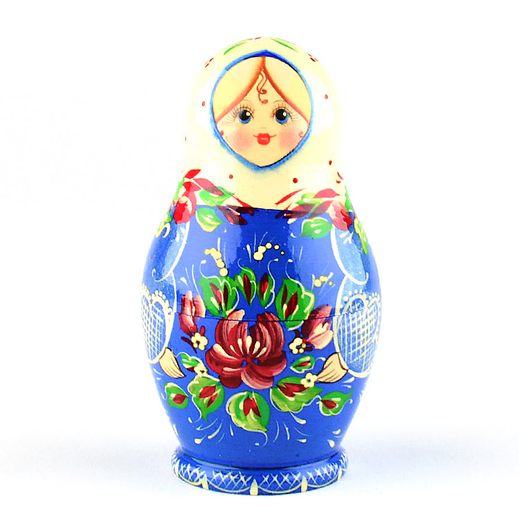 Hand-crafted in Russia, these dolls feature a colorful floral arrangement that stands in stunning contrast to it's wintry blue and white dress. A perfect gift to remind someone that spring is right around the corner.