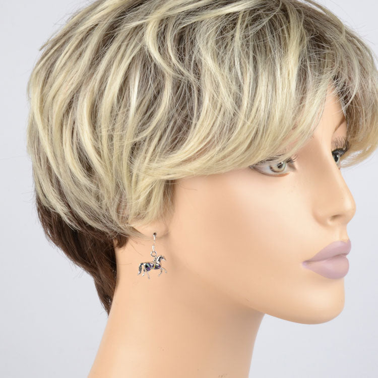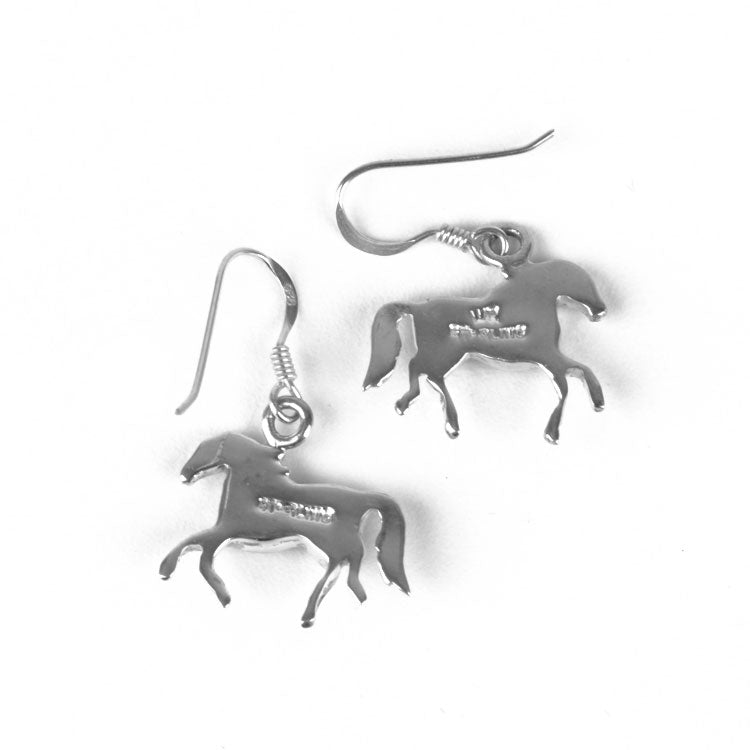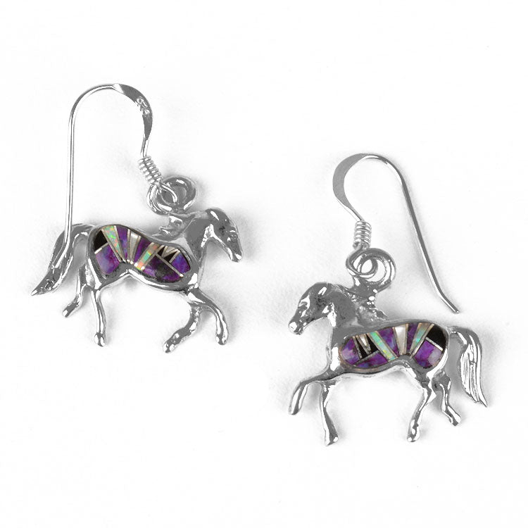 These cute and stylish horse animal earrings are a great find. The small earrings (1 1/8" total length) each feature opal, onyx, and sugilite. The running horse is about 3/4" x 1/2" in size. Simple hooks complete these sterling silver equestrian earrings.