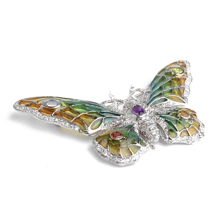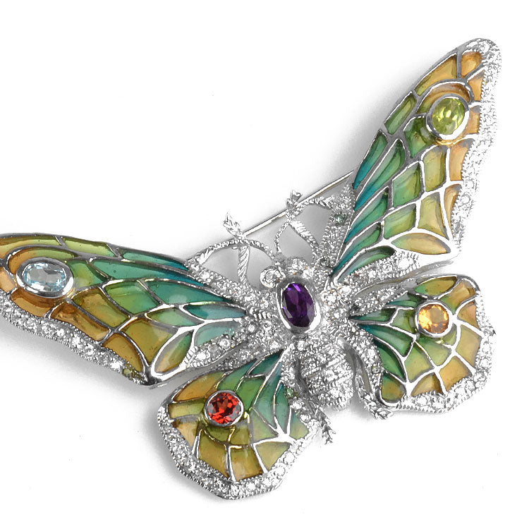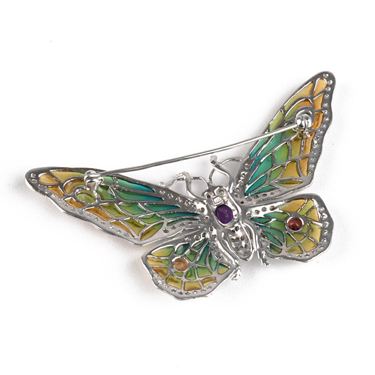 This large butterfly pin offers the most intriguing fashion looks. It is set in a framework of sterling silver. The formation of butterfly's wings patterns is like a puzzle. The artist skillfully filled the cells of the wing with colorful gradient colors of special resin and adorned with five handpicked and polished gemstones: Amethyst, Blue Topaz, Peridot, and Ruby. The body and the edges of the butterfly are paved with white CZ stones. Measure about 3" x 2" in size, large enough to make it a conversational piece.
