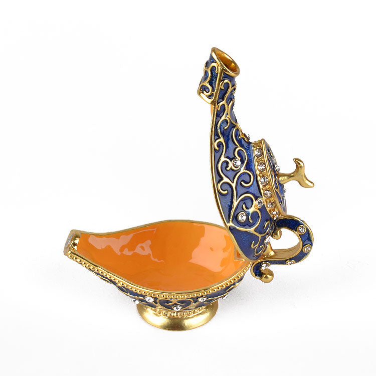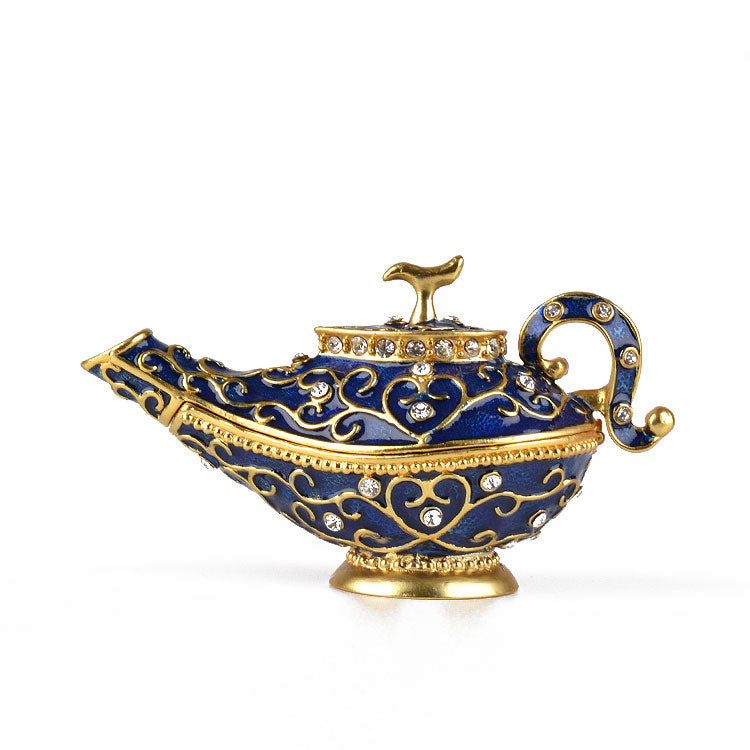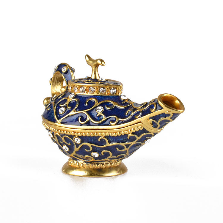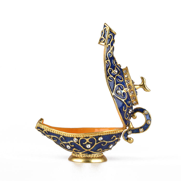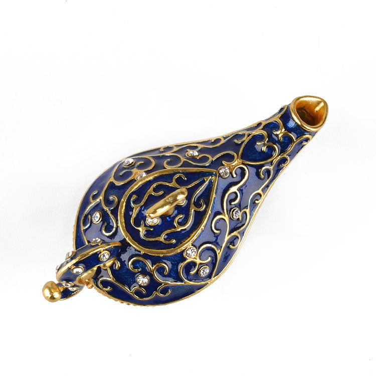 This Faberge style trinket box is constructed from a pewter base, hand enameled with blue and gold, and decorated with clear sparkly Austrian crystals. This magical genie box is hinged, and has a magnet for a clasp. This genie lamp trinket is great just for display or for holding some of your small memorable items. Cute gift for the hard-to-shop-for!