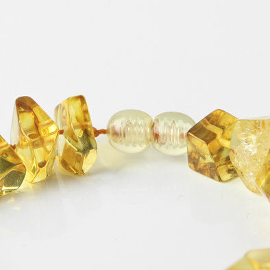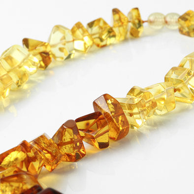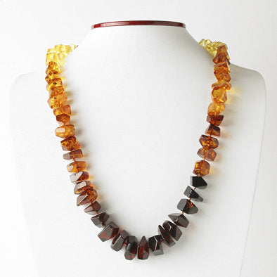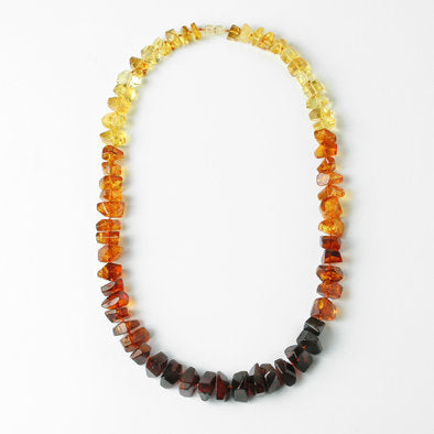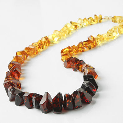 This unique mult-colored graduated strand necklace features amber pieces, cut in geometric shapes to catch the light and add extra shine, strung together by color, creating bold stripes of citrine, honey, cognac, and cherry. Hidden barrel closure.